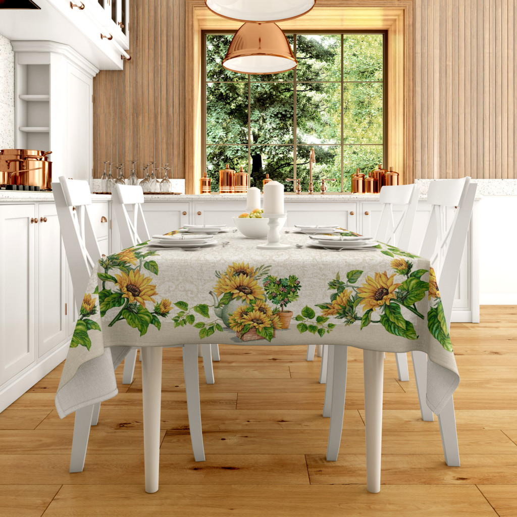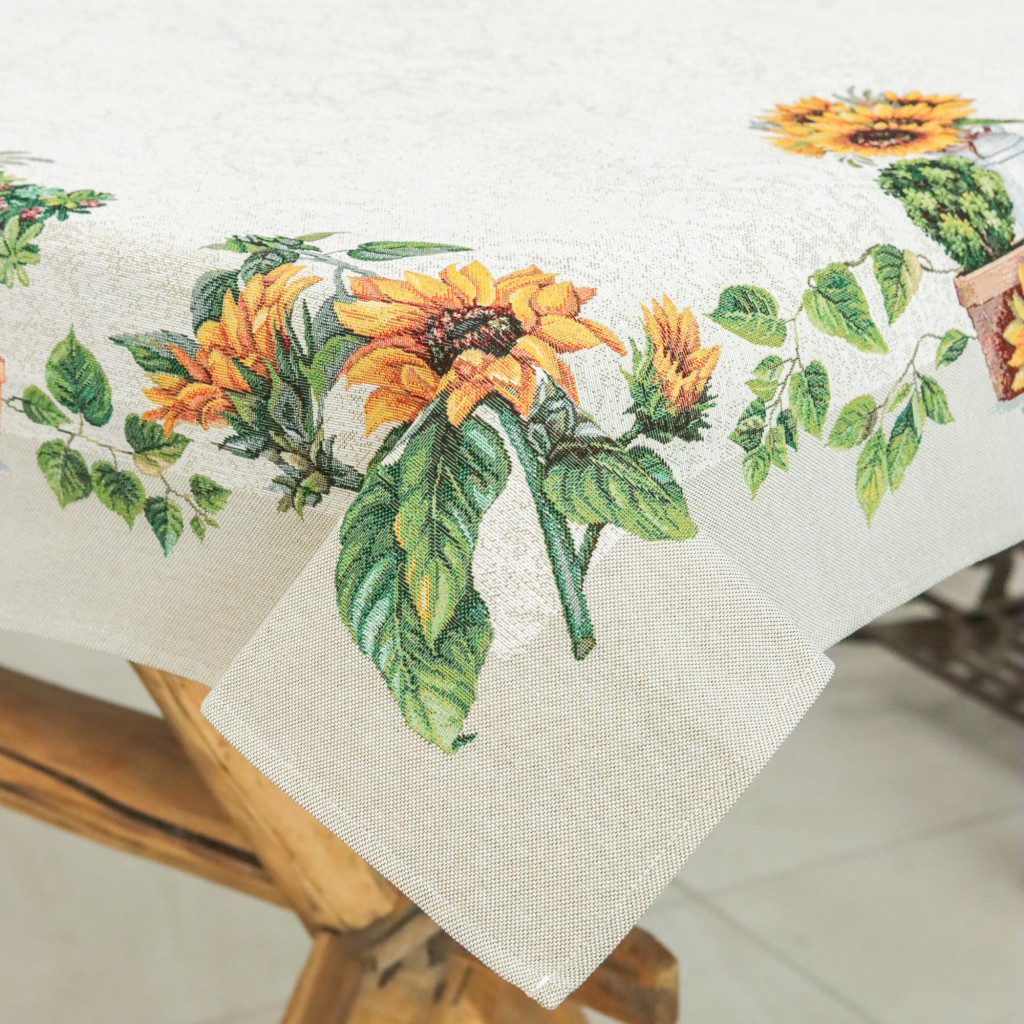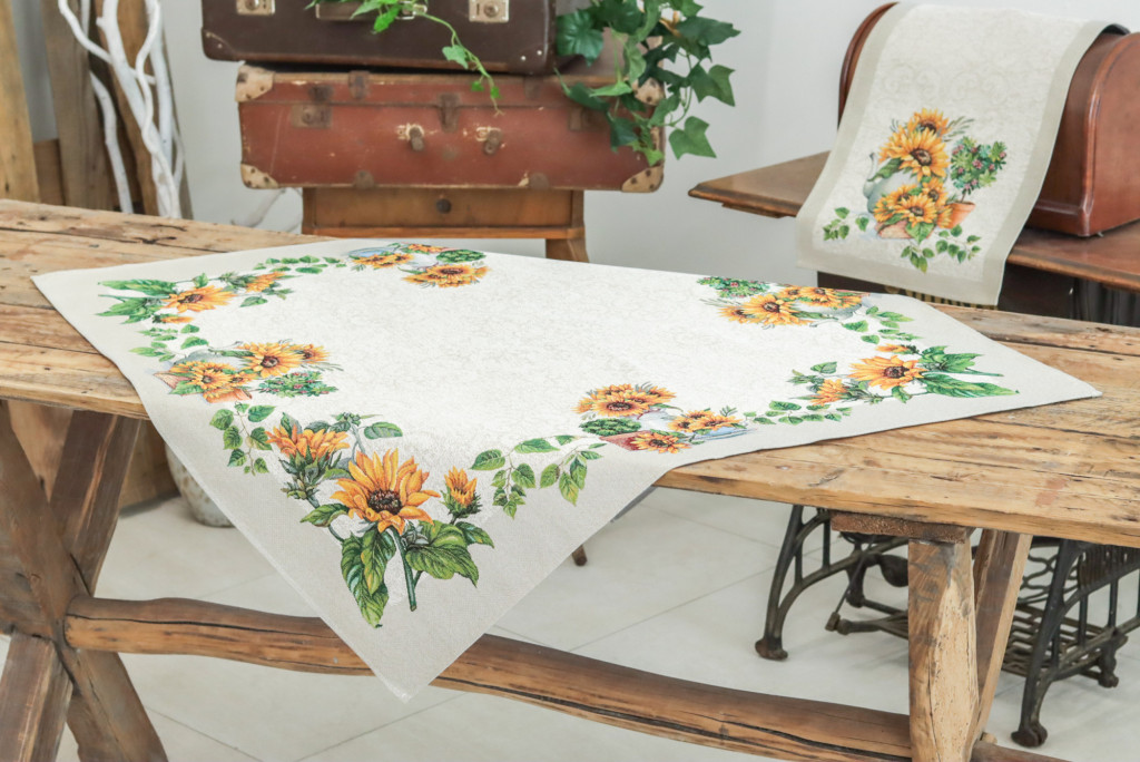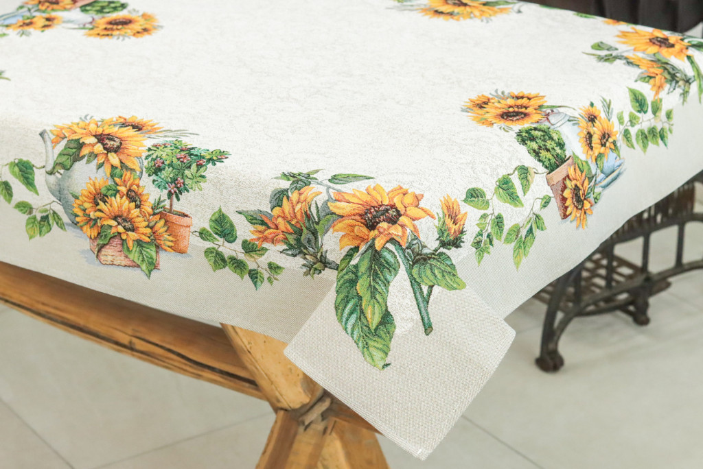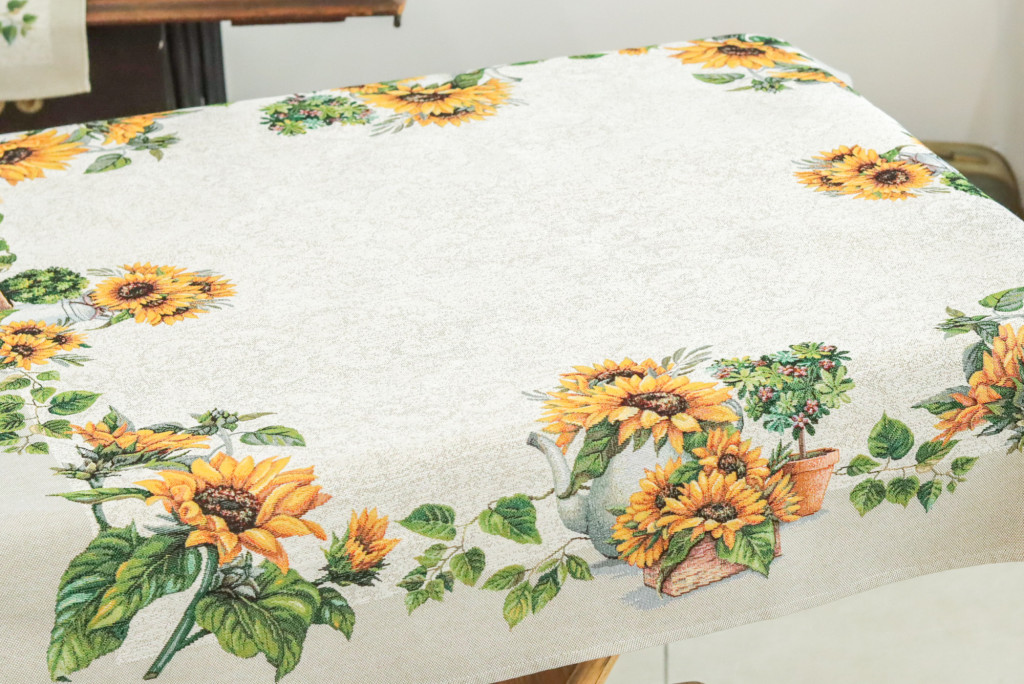 Napraforgókkal dekorált gépi gobelin asztalterítő, amely a megfelelő kezelés mellett hosszú éveken át megőrzi színét és minőségét.