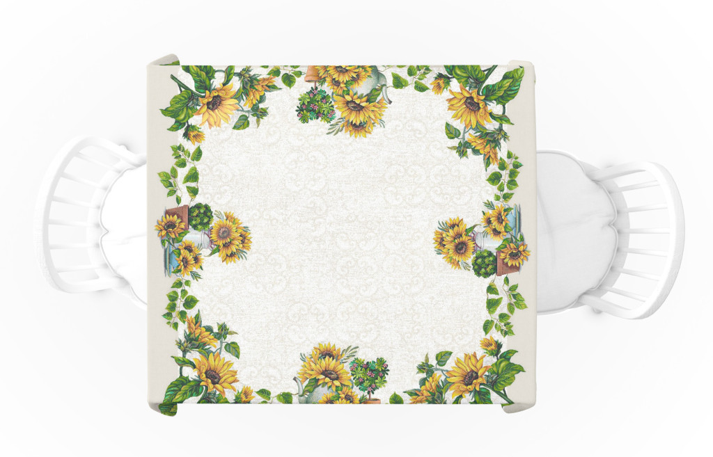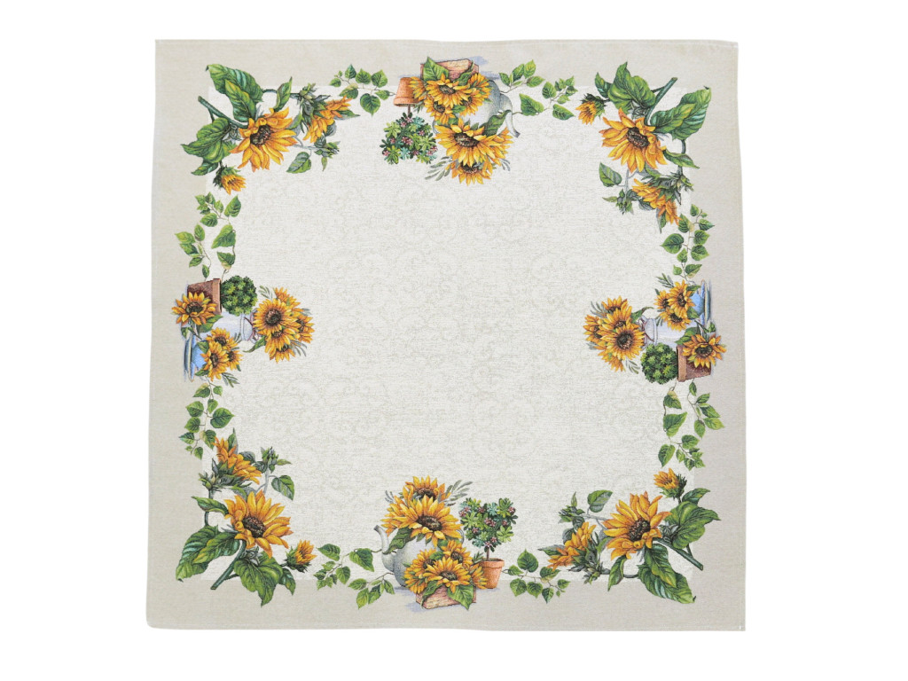 Napraforgókkal dekorált prémium minőségű, vastag anyagból készült gépi gobelin terítő. Származási hely: Spanyolország