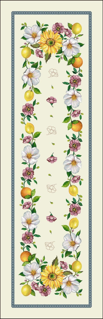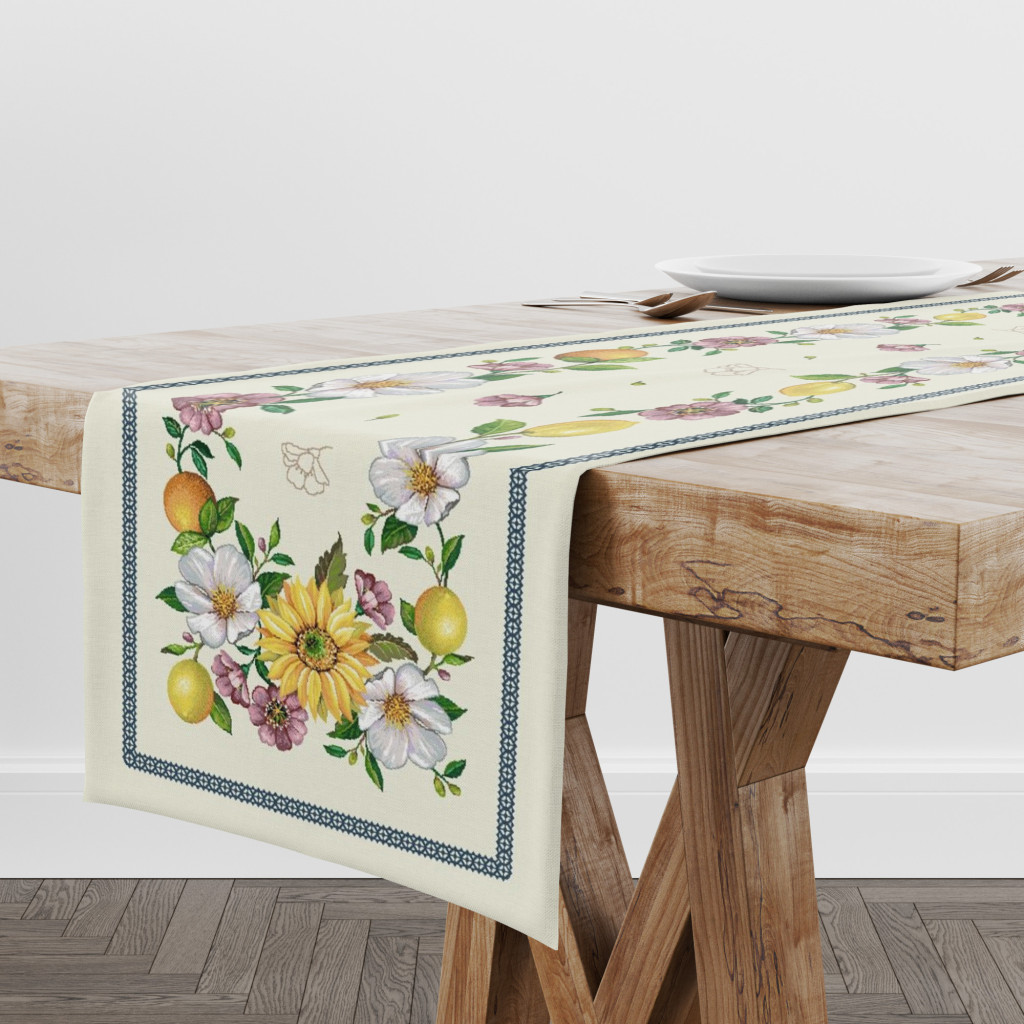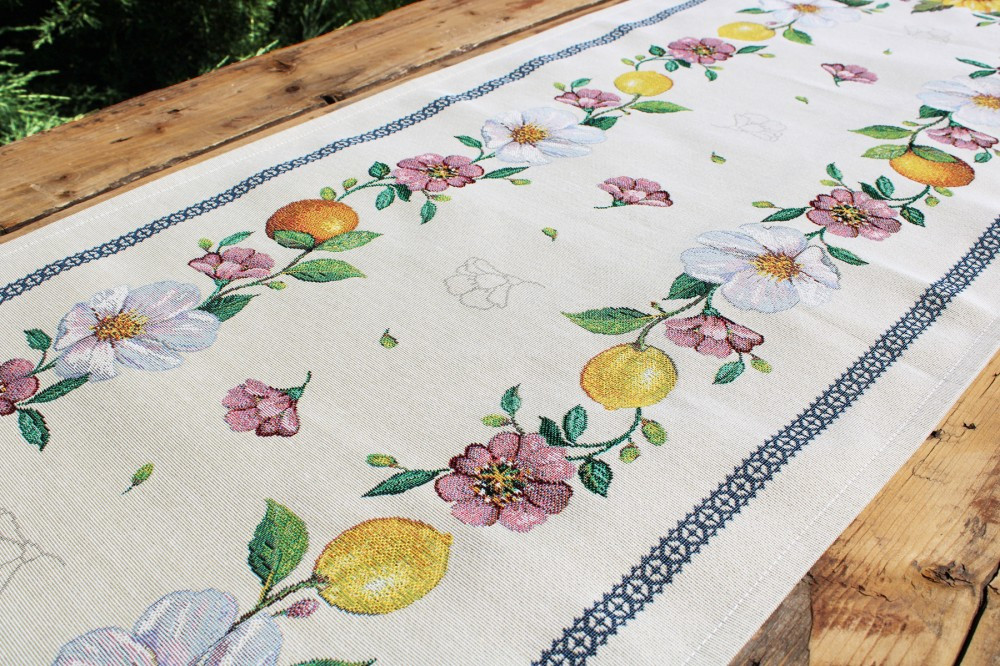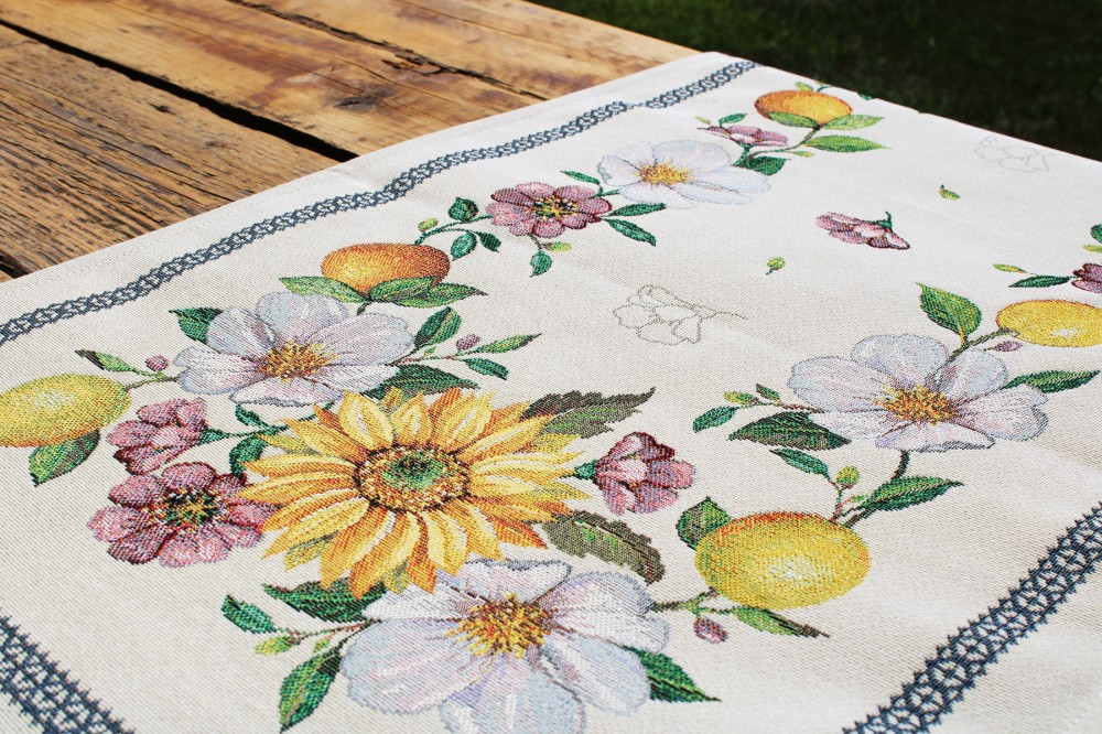 Napraforgós, citromos mintákkal dekorált, mediterrán hangulatú asztali futó. Lepd meg magad vagy szeretteidet egy prémium minőségű asztalterítővel!