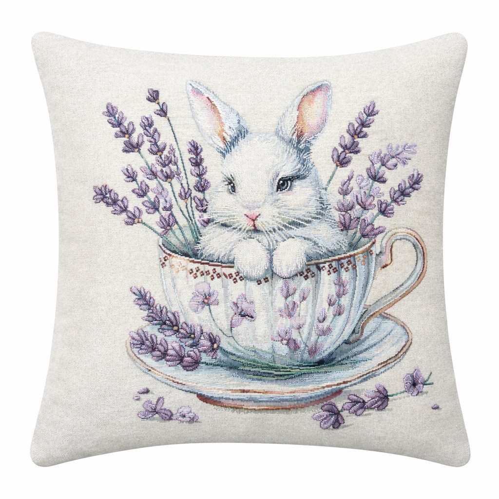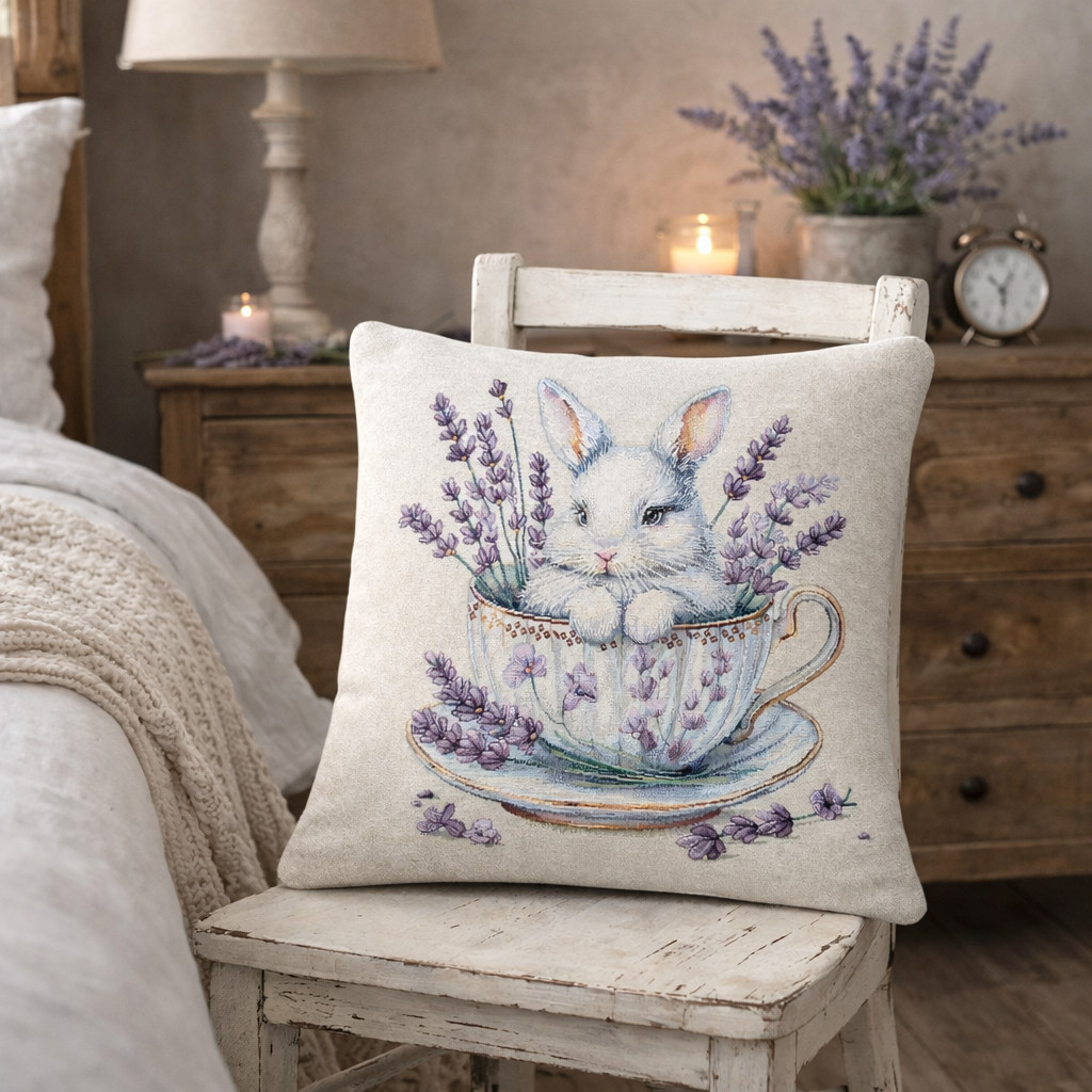 Gépi szövésű spanyol gobelin párnahuzat – levendulás, nyuszis romantikus design