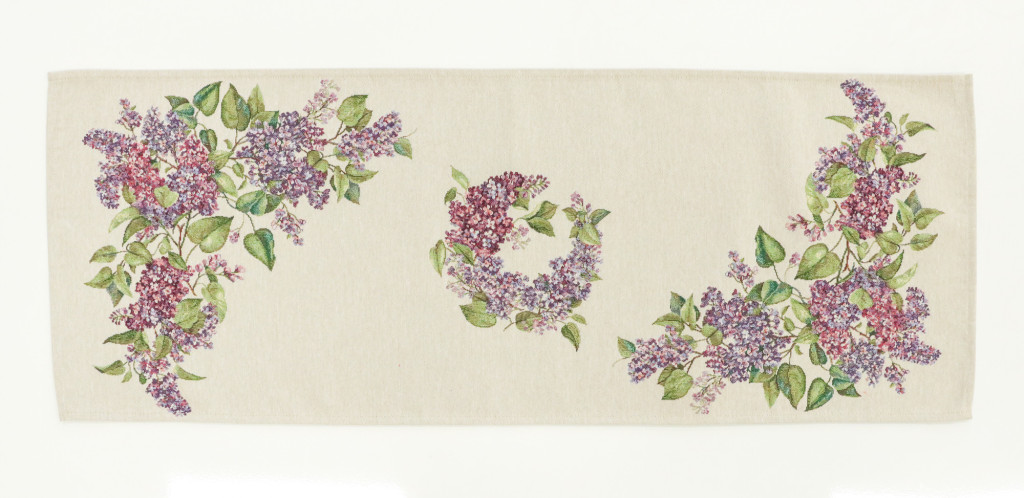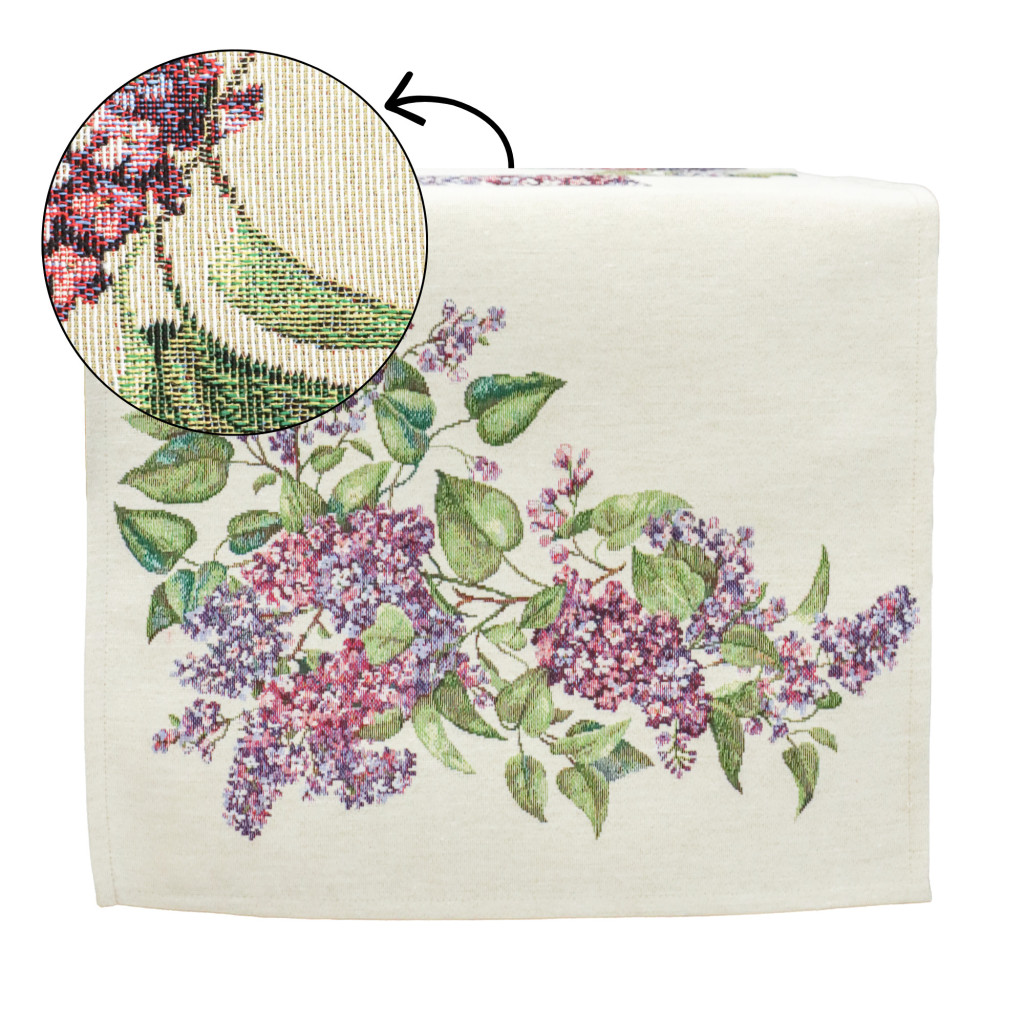 Ez a különleges spanyol gobelin asztali futó a klasszikus gobelin megjelenést ötvözi a modern, precíz gépi szövési technológiával. A részletgazdag minta virágzó orgonaágakat ábrázol finom lila árnyalatokkal és természetes zöld levelekkel, amelyek harmonikus, nyugodt és elegáns hangulatot visznek az étkezőbe vagy a nappaliba.