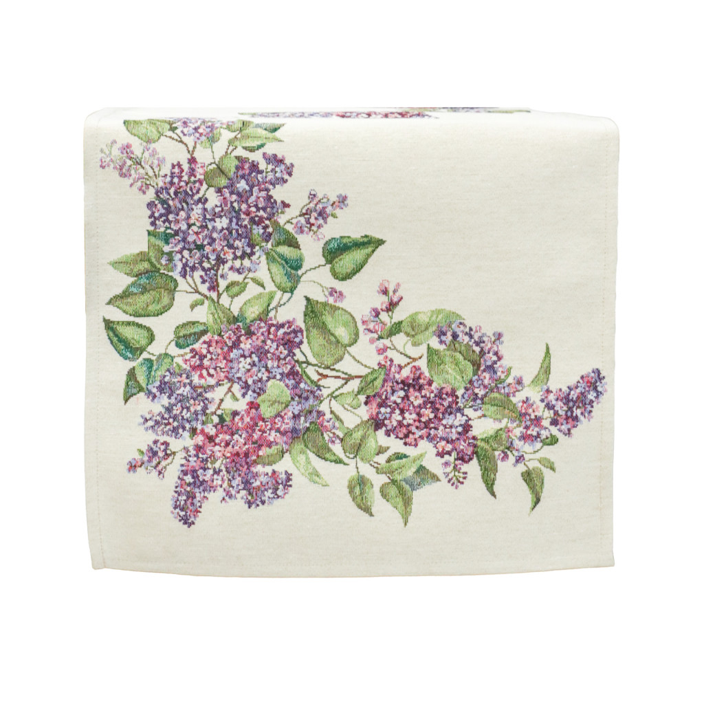 Ez a különleges spanyol gobelin asztali futó a klasszikus gobelin megjelenést ötvözi a modern, precíz gépi szövési technológiával. A részletgazdag minta virágzó orgonaágakat ábrázol finom lila árnyalatokkal és természetes zöld levelekkel, amelyek harmonikus, nyugodt és elegáns hangulatot visznek az étkezőbe vagy a nappaliba.