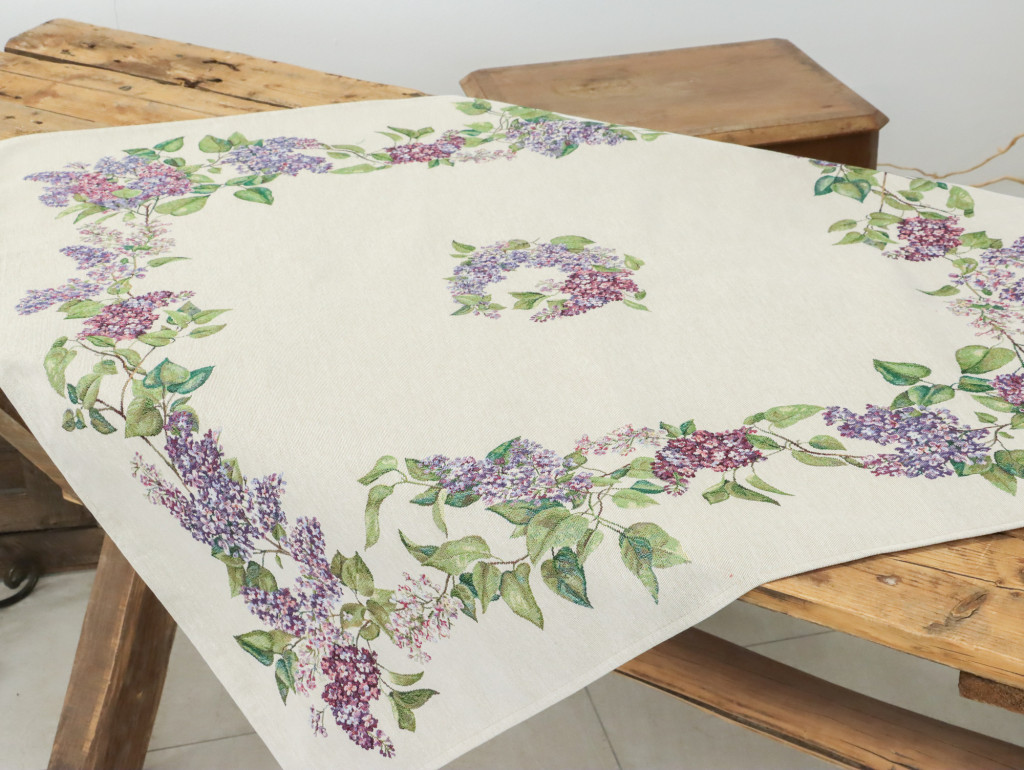 A részletgazdag minta virágzó orgonaágakat ábrázol, finom lila árnyalatokkal és természetes zöld levelekkel, amelyek harmonikus, nyugodt és elegáns hangulatot visznek az otthonba.