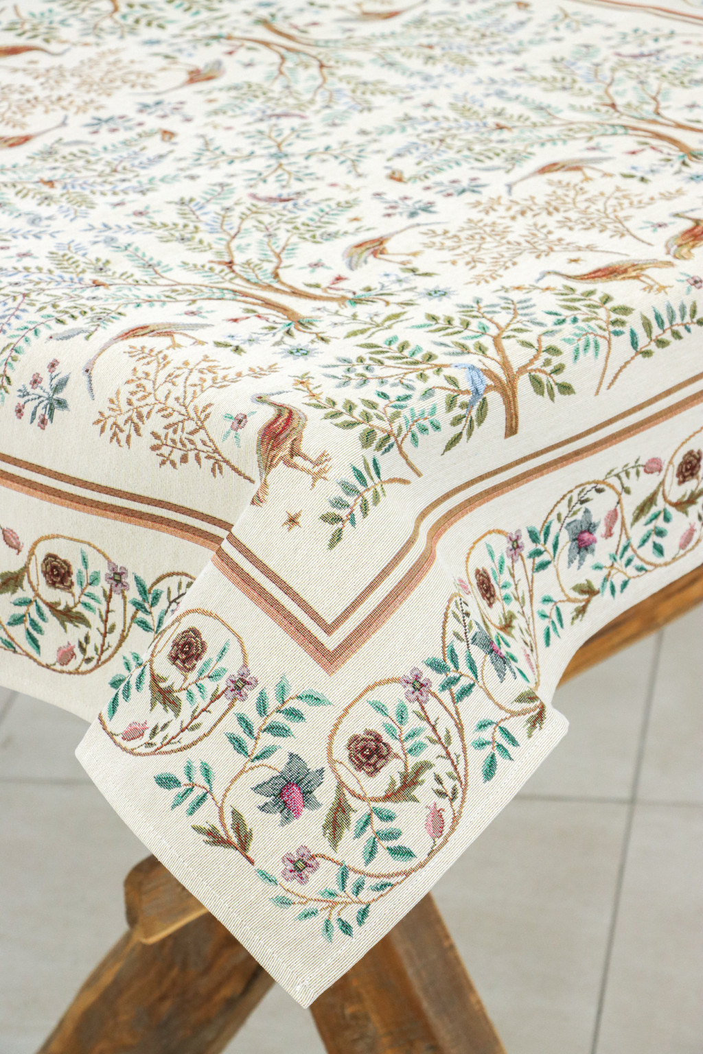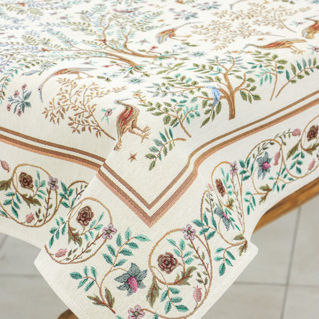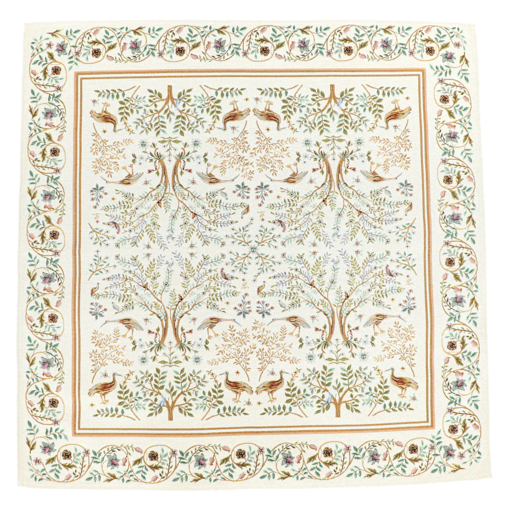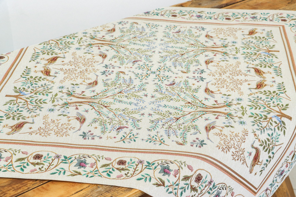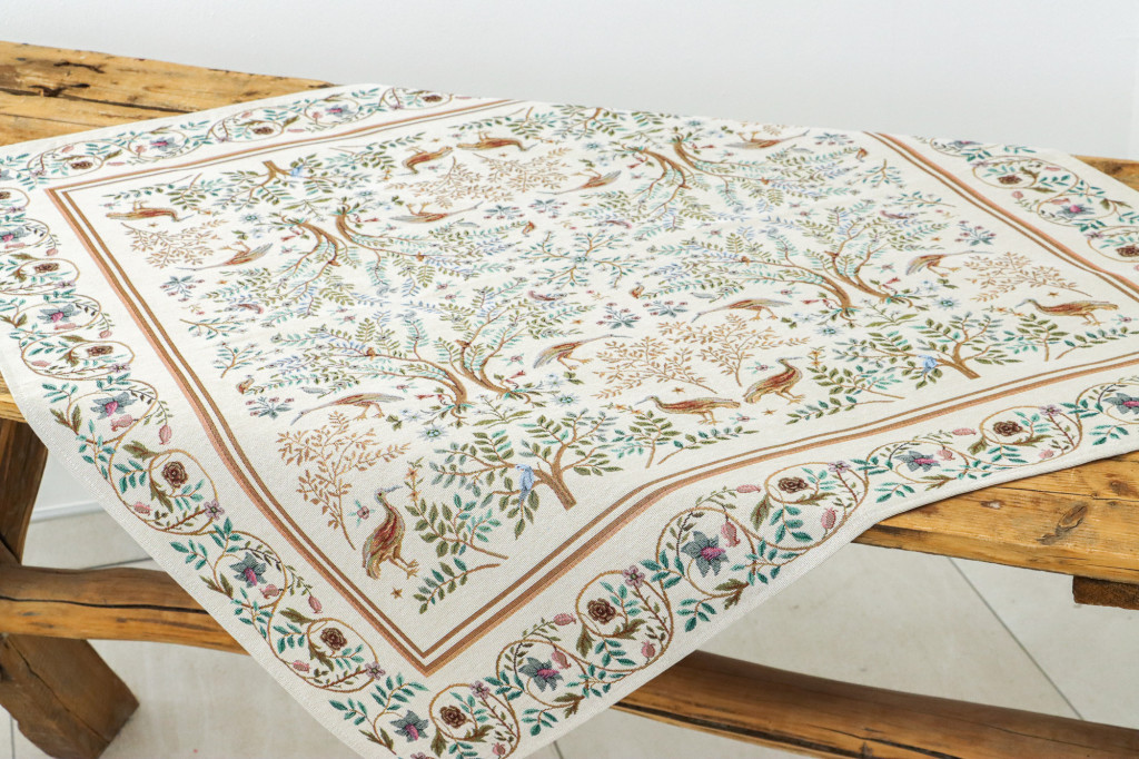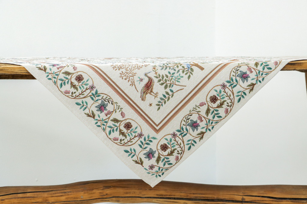 Elegáns, gépi szövésű gobelin terítő Spanyolországból, gazdag részletességű erdei madaras mintával. Igényes dísze étkezőnek vagy nappalinak. A klasszikus erdei jelenetek – madarak, szarvasok és indázó ágak – William Morris művészetét ábrázolják, harmonikusan illeszkednek rusztikus, vintage vagy klasszikus enteriőrbe is.