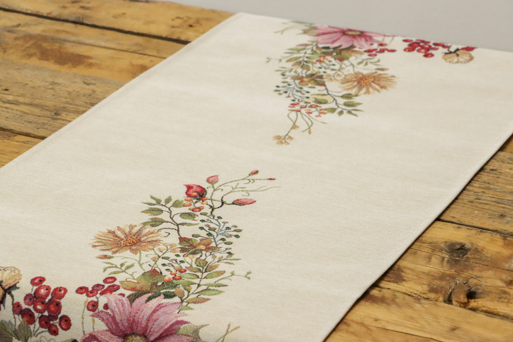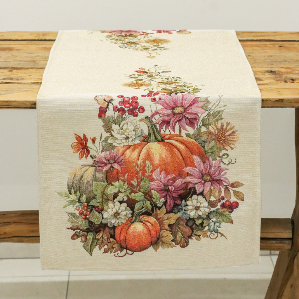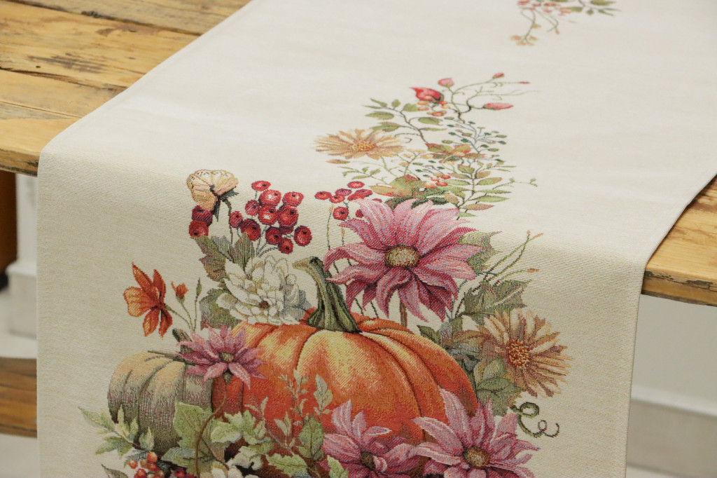 Tökökkel és virágokkal dekorált, prémium minőségű asztali futó. Anyaga gépi szövésű gobelin, amely tartós és szépségét évekig megőrzi. Tökéletes választás ünnepi vacsorákhoz, családi összejövetelekhez vagy bármely őszi alkalomhoz, ahol egy kis természetes eleganciát szeretnénk csempészni az otthonunkba.