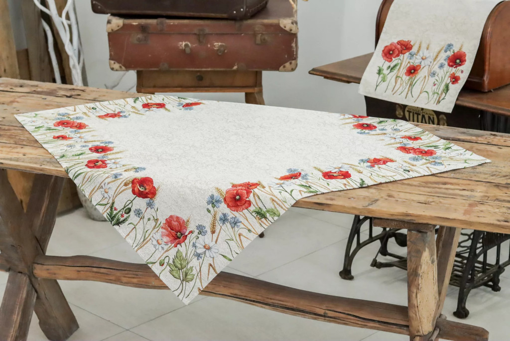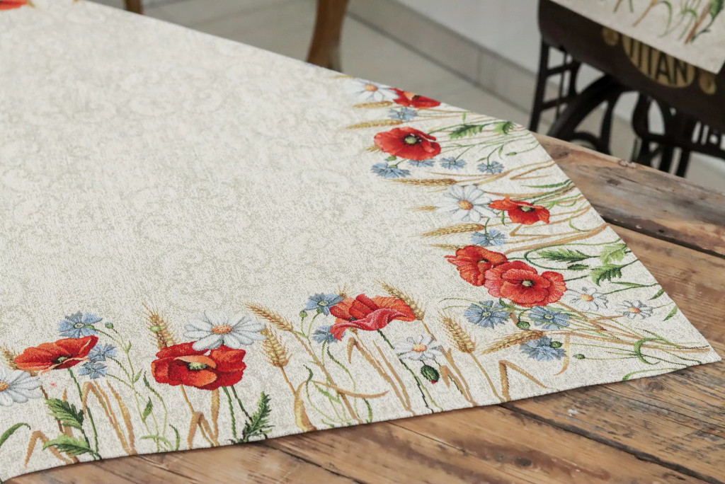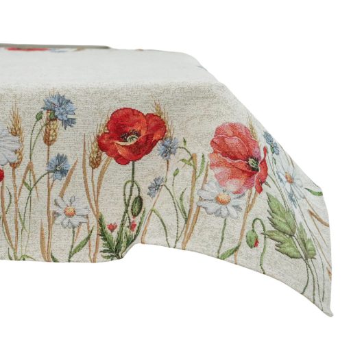 Pipacsokkal, búzavirággal és mezei virágokkal dekorált gépi gobelin asztalterítő, amely a megfelelő kezelés mellett hosszú éveken át megőrzi színét és minőségét.