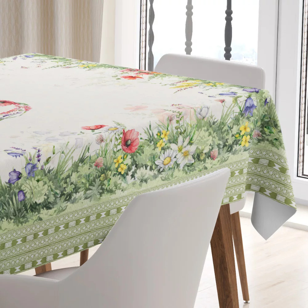 Ez a lenyűgöző asztalterítő friss és üde hangulatot varázsol otthonába. A 140x180 cm méretű terítőn élénk pipacsok és mezei virágok alkotnak gyönyörű keretet, míg a közepén egy elegáns virágkoszorú díszeleg. Ideális választás ünnepi alkalmakra vagy a mindennapi étkezésekhez. Keresd a többi virágos terítőt a webshopban!
