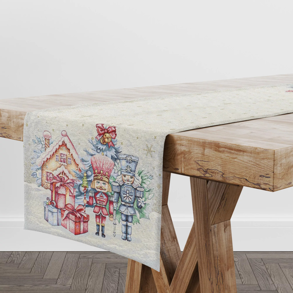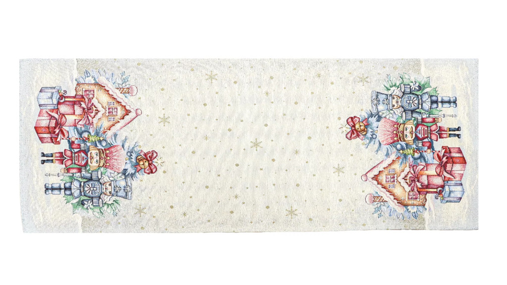 Teremts mesés ünnepi hangulatot ezzel a diótörős gépi gobelin asztali futóval! A futó mintázatán diótörő figurák, feldíszített karácsonyfa, ajándékcsomagok, mézeskalács házikó jelennek meg. Tökéletes választás ünnepi családi vacsorákhoz, vendégségekhez vagy karácsonyi dekorációként komódra, kávézóasztalra is.