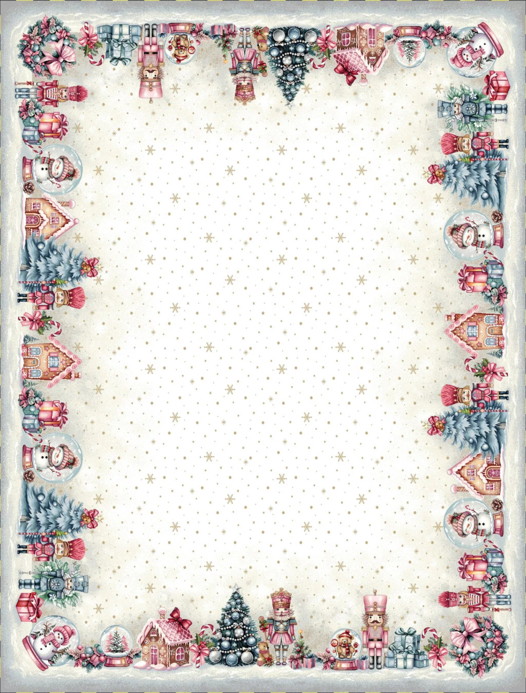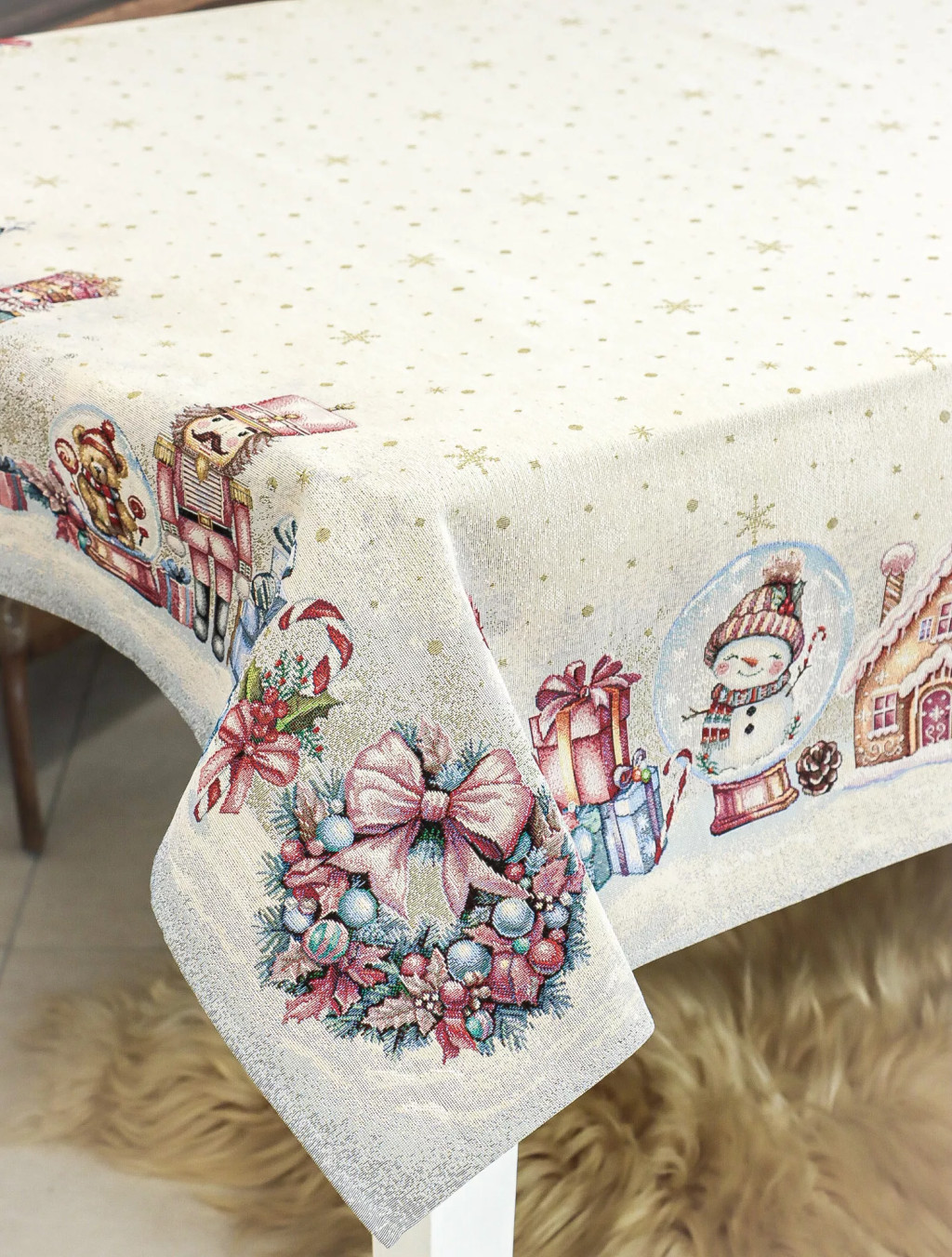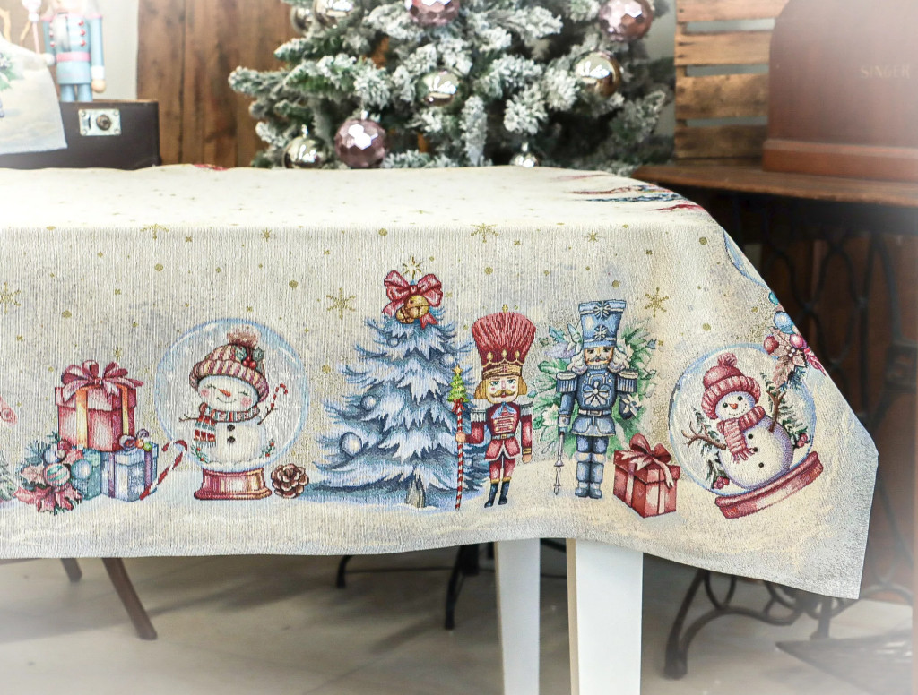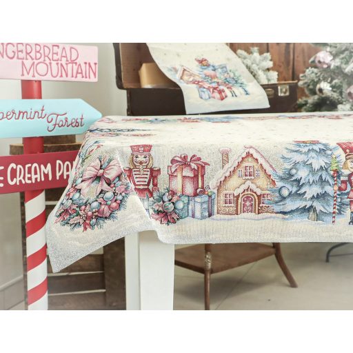 Teremts mesés ünnepi hangulatot ezzel a diótörős gépi gobelin asztalterítővel! A terítő mintázatán diótörő figurák, feldíszített karácsonyfák, ajándékcsomagok, mézeskalács házikók és karácsonyi gömbök jelennek meg. A középrész világos, finom arany pöttyökkel és hópelyhekkel díszített, így elegánsan emeli ki az asztali dekorációt vagy a tálalást. Mérete ideális 4-6 személyes étkezőasztalokhoz. A prémium minőségű, gépi szövésű spanyol gobelin tartós és elegáns, így mindennapi használatra és ünnepi alkalmakra is tökéletes.