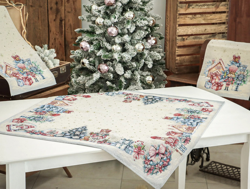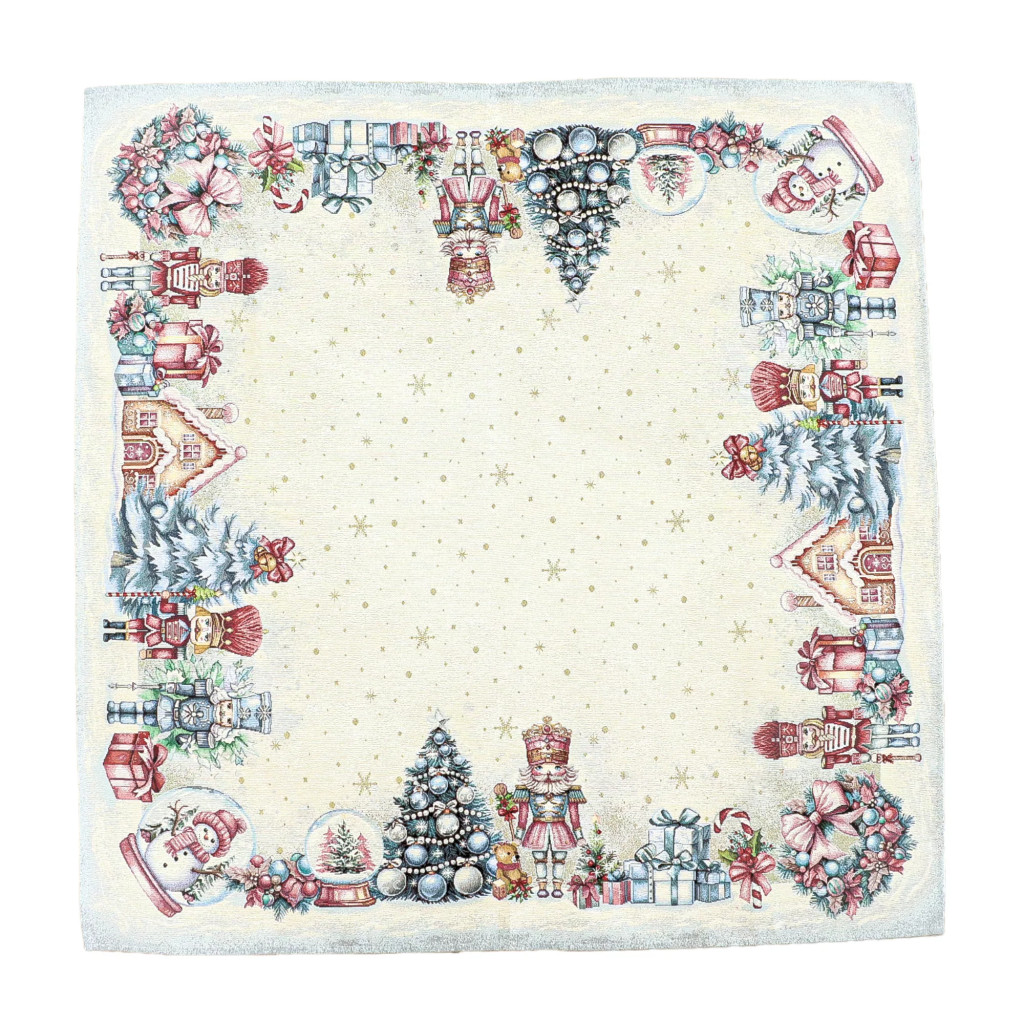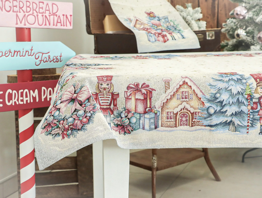 Teremts mesés ünnepi hangulatot ezzel a diótörős gépi gobelin asztalterítővel! A terítő mintázatán diótörő figurák, feldíszített karácsonyfák, ajándékcsomagok, mézeskalács házikók és karácsonyi gömbök jelennek meg. A középrész világos, finom arany pöttyökkel és hópelyhekkel díszített, így elegánsan emeli ki az asztali dekorációt vagy a tálalást. Tökéletes választás ünnepi családi vacsorákhoz, vendégségekhez vagy karácsonyi dekorációként komódra, kávézóasztalra is.