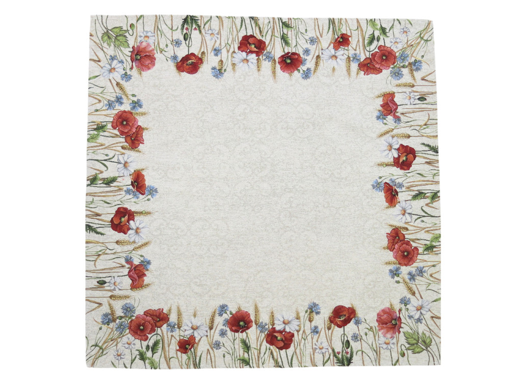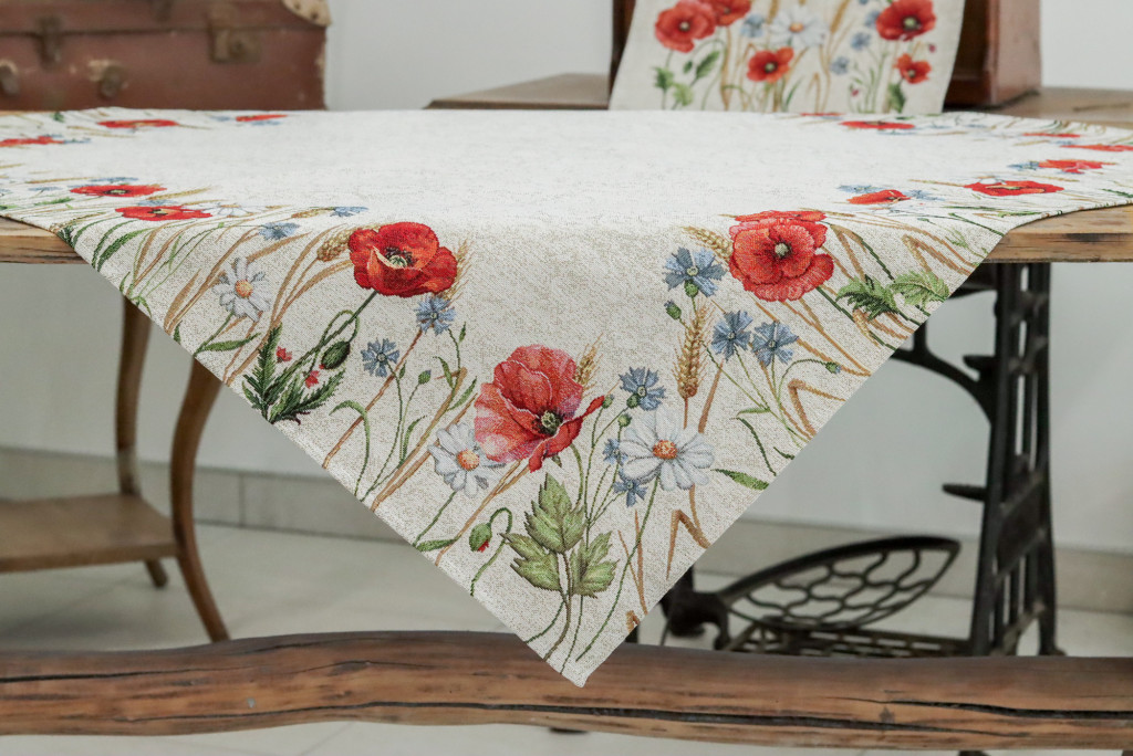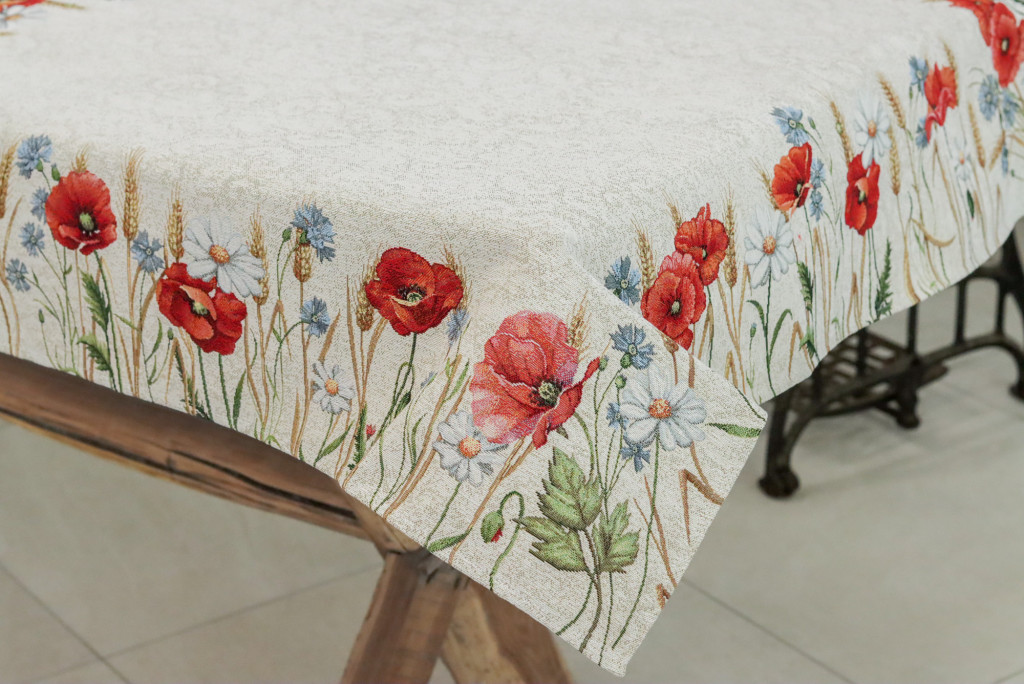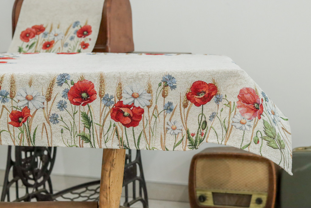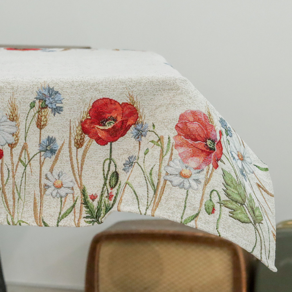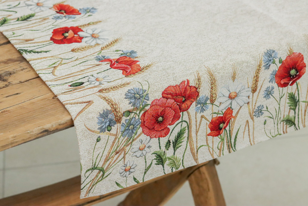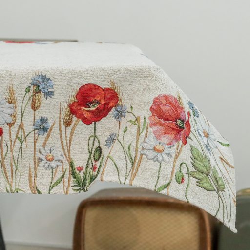 Pipacsokkal, búzavirággal és mezei virágokkal dekorált gépi gobelin asztalterítő, amely a megfelelő kezelés mellett hosszú éveken át megőrzi színét és minőségét.