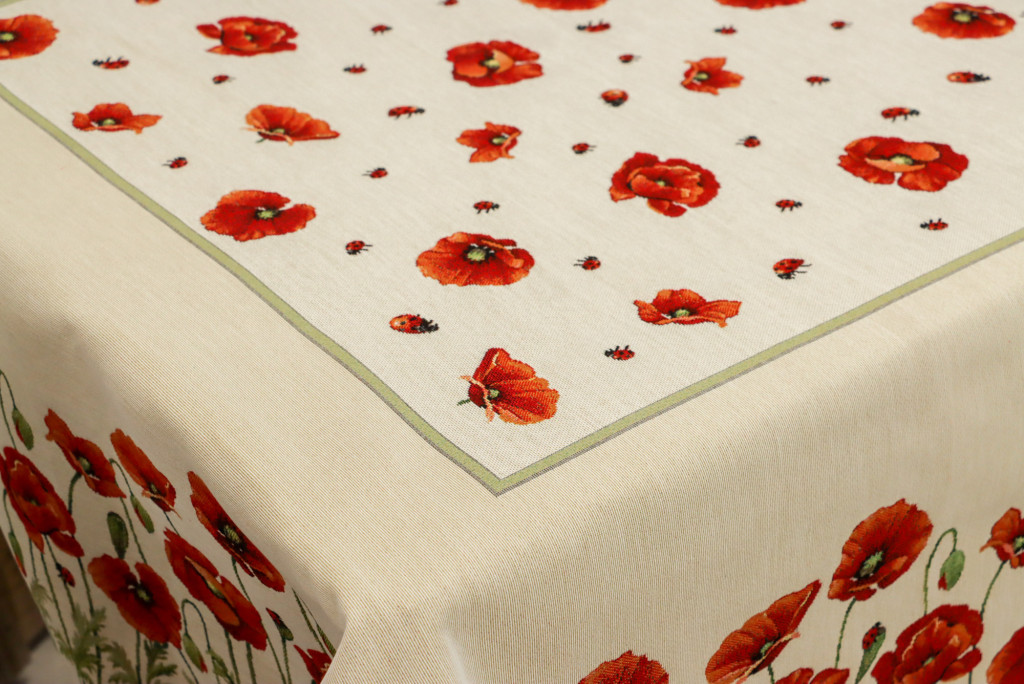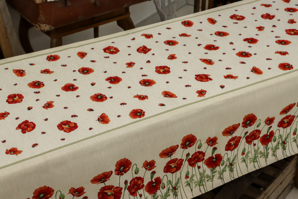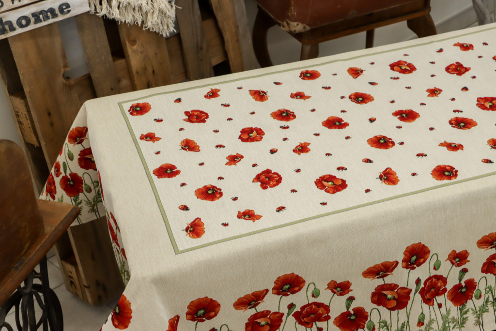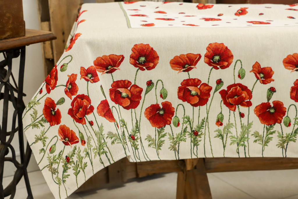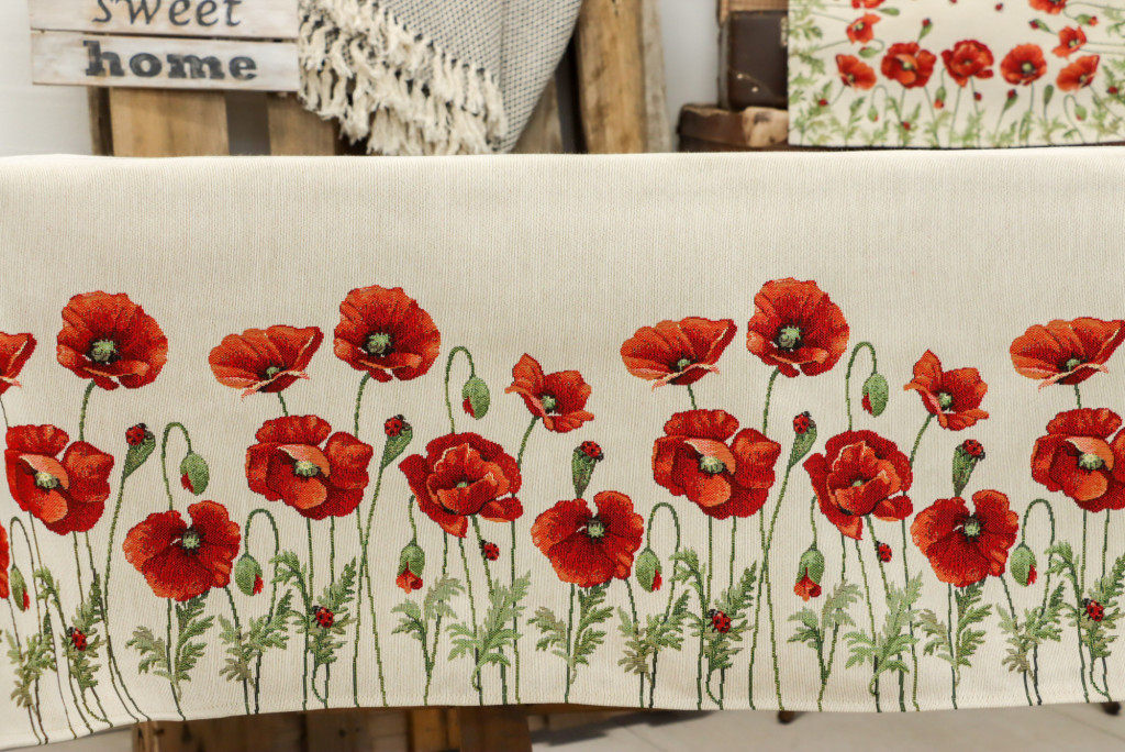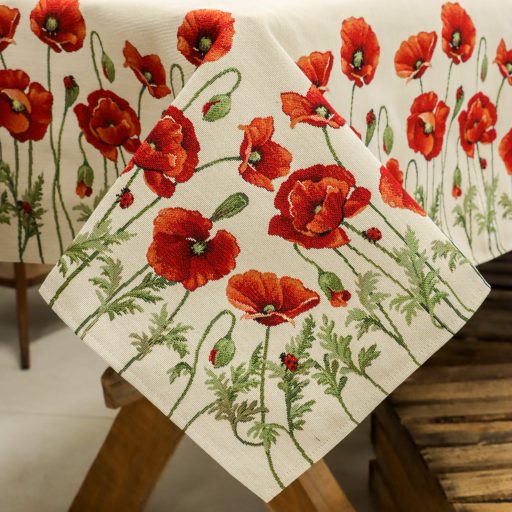 Gyönyörű pipacs virágokkal díszített asztalterítő, melynek egyedülálló szépsége minden tekintetet az asztalra vonz. Lepd meg magad vagy szeretteidet egy prémium minőségű asztalterítővel!