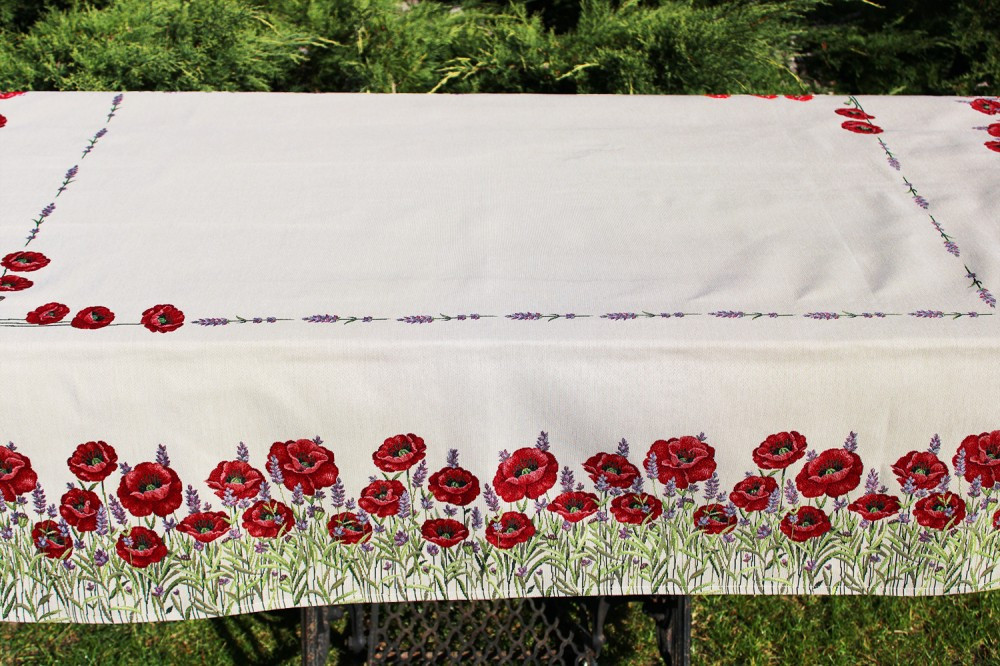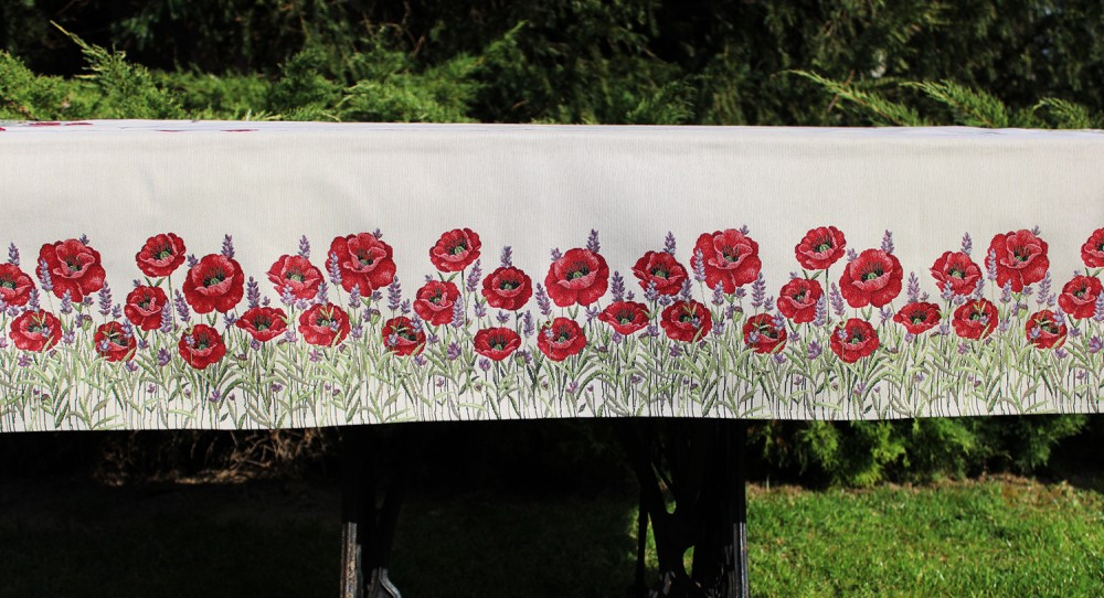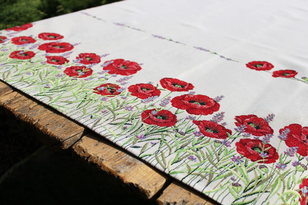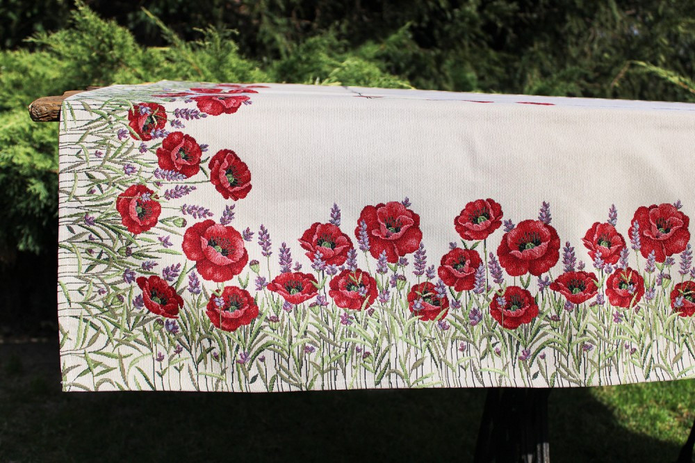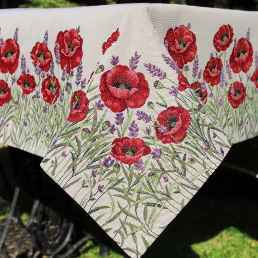 Pipacsos, levendulás asztalterítő. Egyedülálló szépsége minden tekintetet az asztalra vonz. Lepd meg magad vagy szeretteidet egy prémium minőségű asztalterítővel!