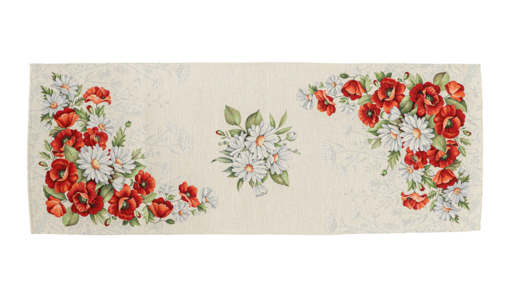 Pipacsokkal, margarétákkal dekorált prémium minőségű, vastag anyagból készült gépi gobelin futó. Származási hely: Spanyolország