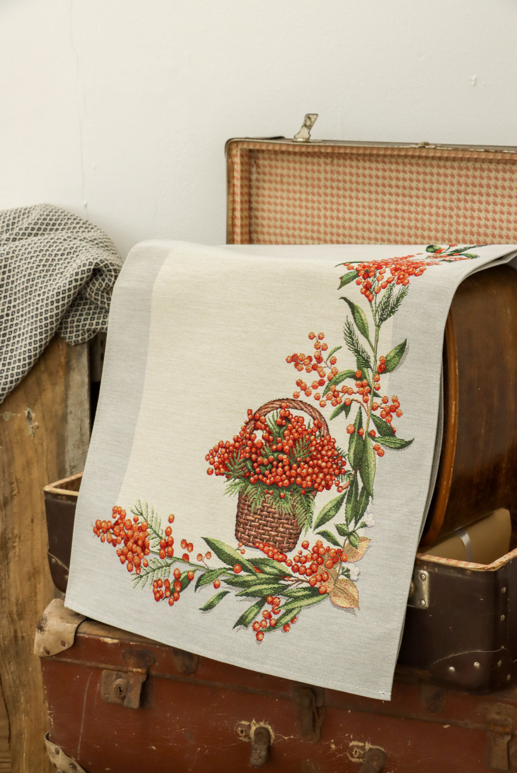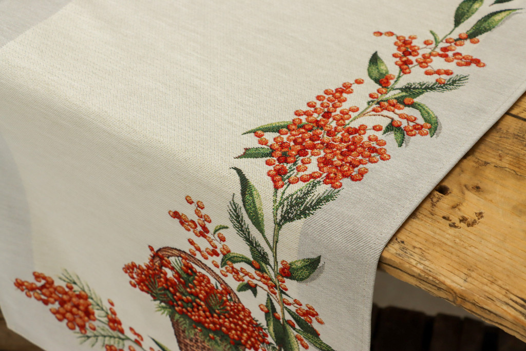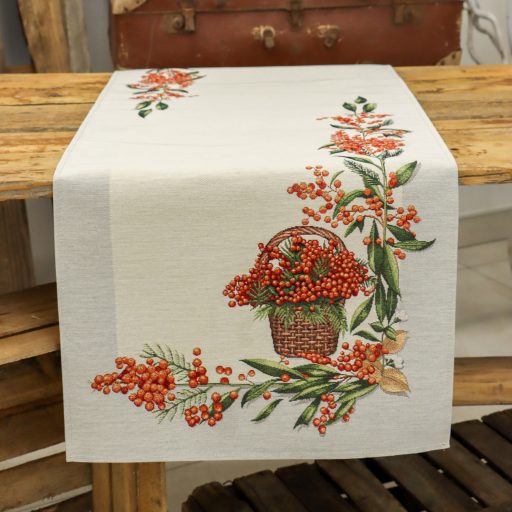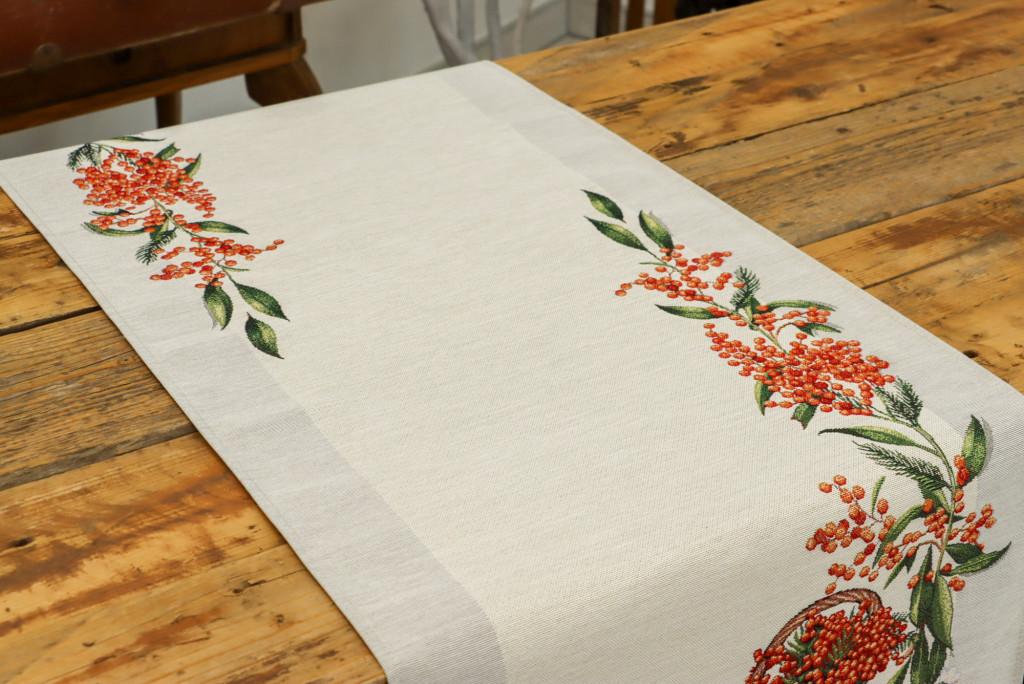 Gyönyörű piros bogyós növénnyel díszített asztali futó. Lepd meg magad vagy szeretteidet egy prémium minőségű asztalterítővel!