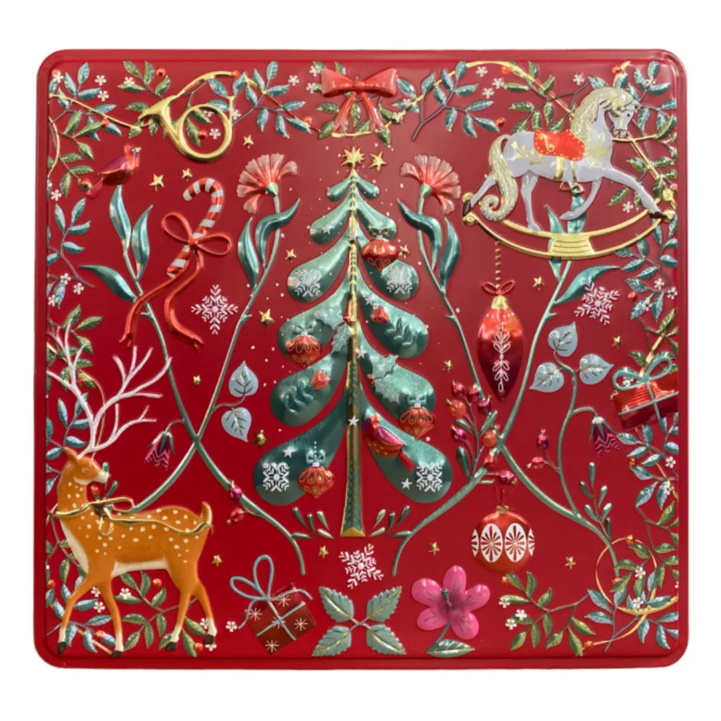 Gondosan megmunkált, piros fém sütis doboz. Egyedi motívumai teszi különlegessé, a dobozba mindenféle finomságot is belepakolhatunk. A termék élelmiszerbiztos, így az édesség közvetlenül is belekerülhet.