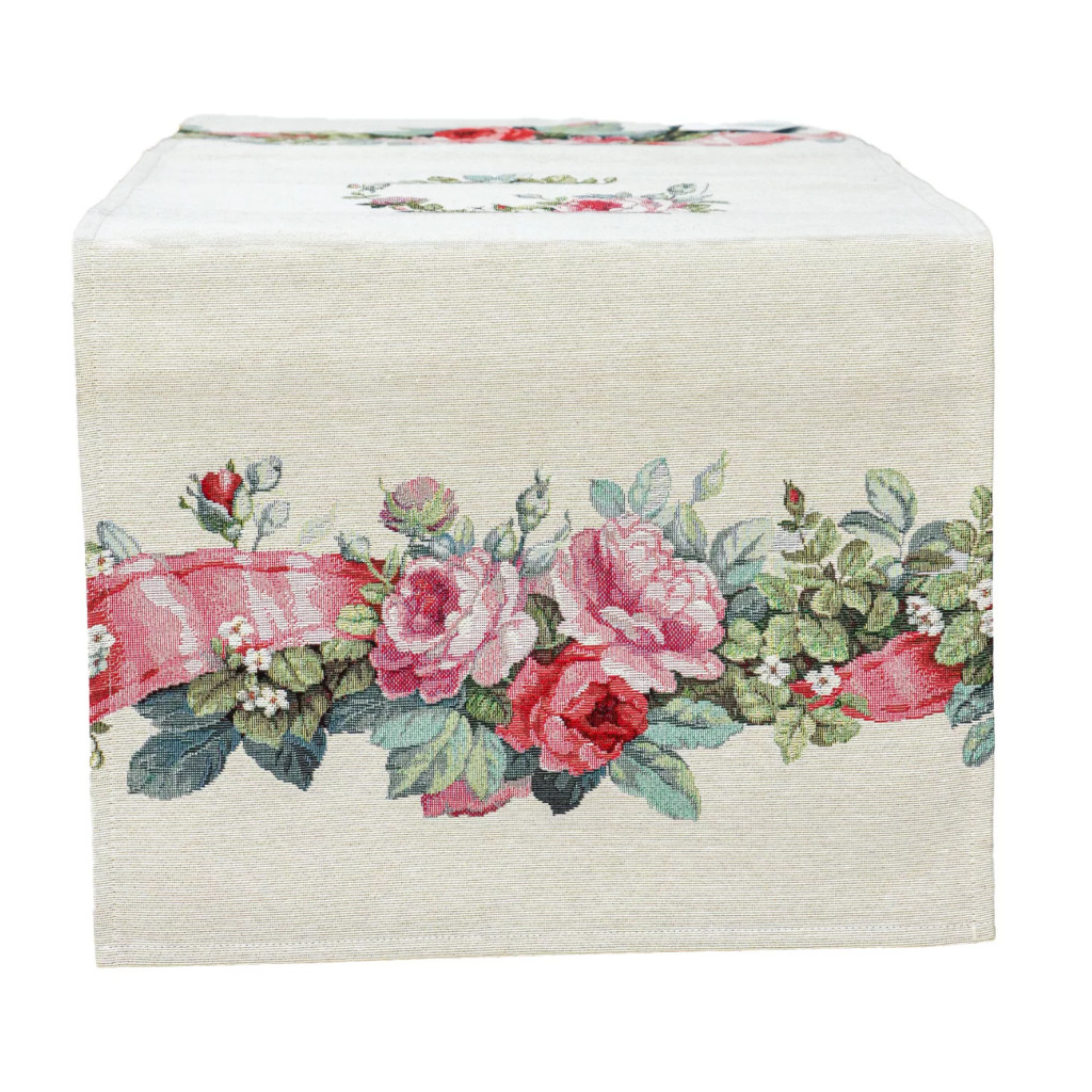 Varázsold az étkezőasztalt egy romantikus, virágos kertté a „Rózsakert” spanyol gépi gobelin asztali futóval! A prémium minőségű futó gazdag rózsa- és levélmotívumokkal, valamint játékos rózsaszín szalagdíszítéssel keretezi az asztalt. A középen elhelyezett apró virágkoszorú finom, elegáns részlet, amely különleges hangulatot ad bármilyen terítésnek.