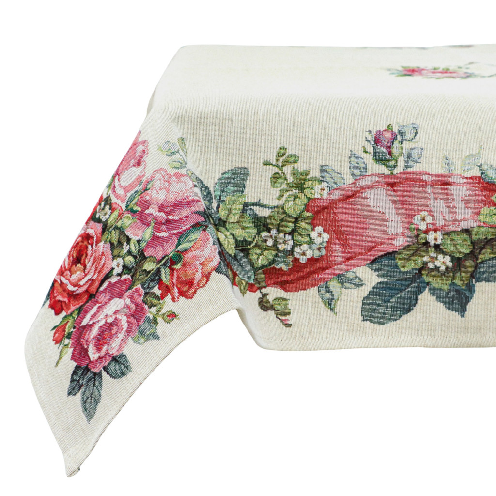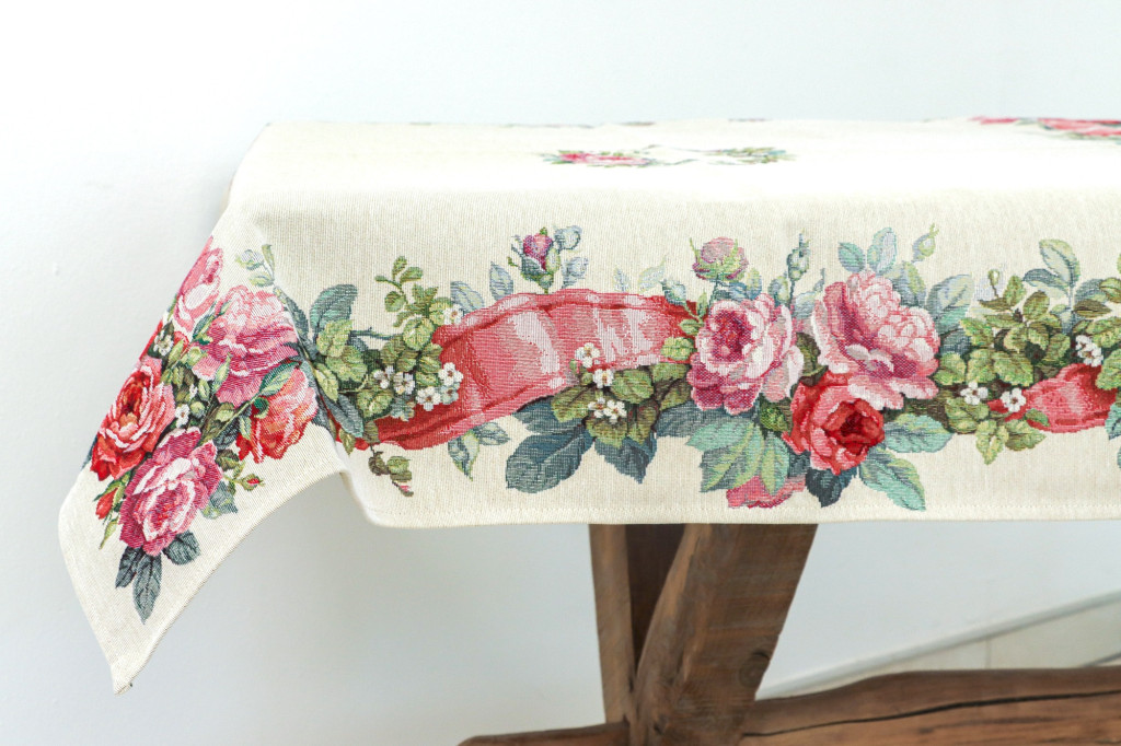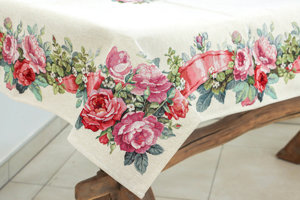 Romantikus stílusú, spanyol gépi gobelin asztalterítő rózsás és szalagos mintával. Elegáns dísze étkezőnek, kávézóasztalnak vagy ünnepi terítésnek.