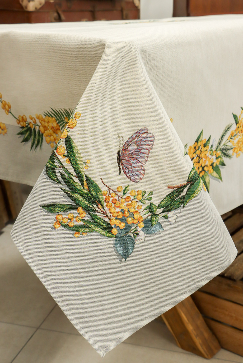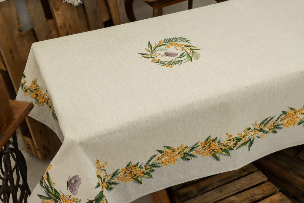 Gyönyörű sárga mimóza virágokkal díszített asztalterítő, melynek egyedülálló szépsége minden tekintetet az asztalra vonz. Lepd meg magad vagy szeretteidet egy prémium minőségű asztalterítővel!