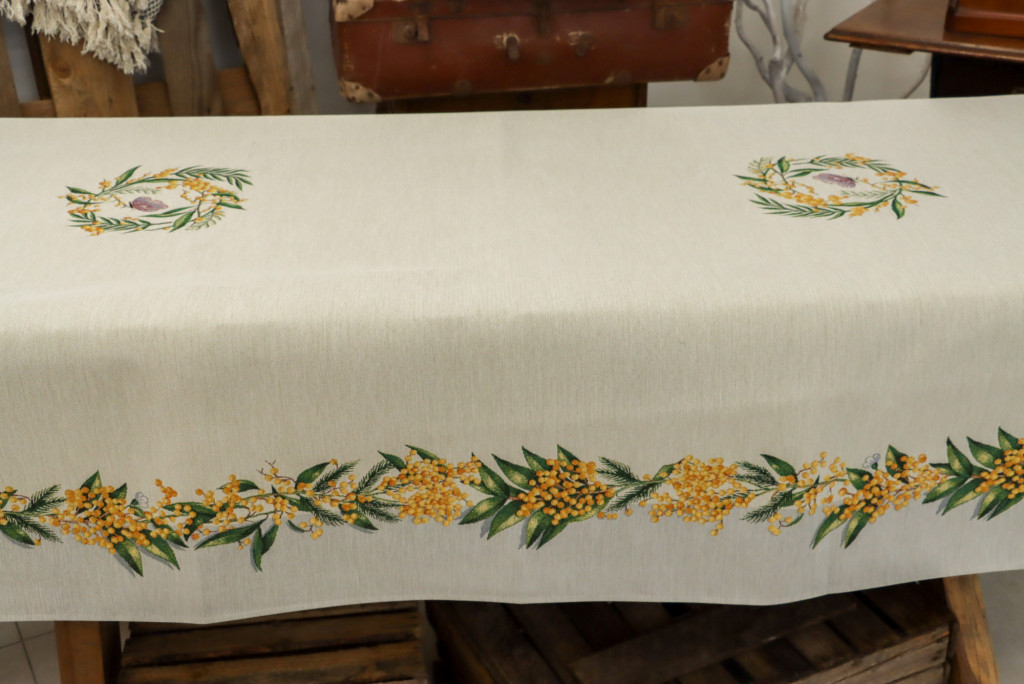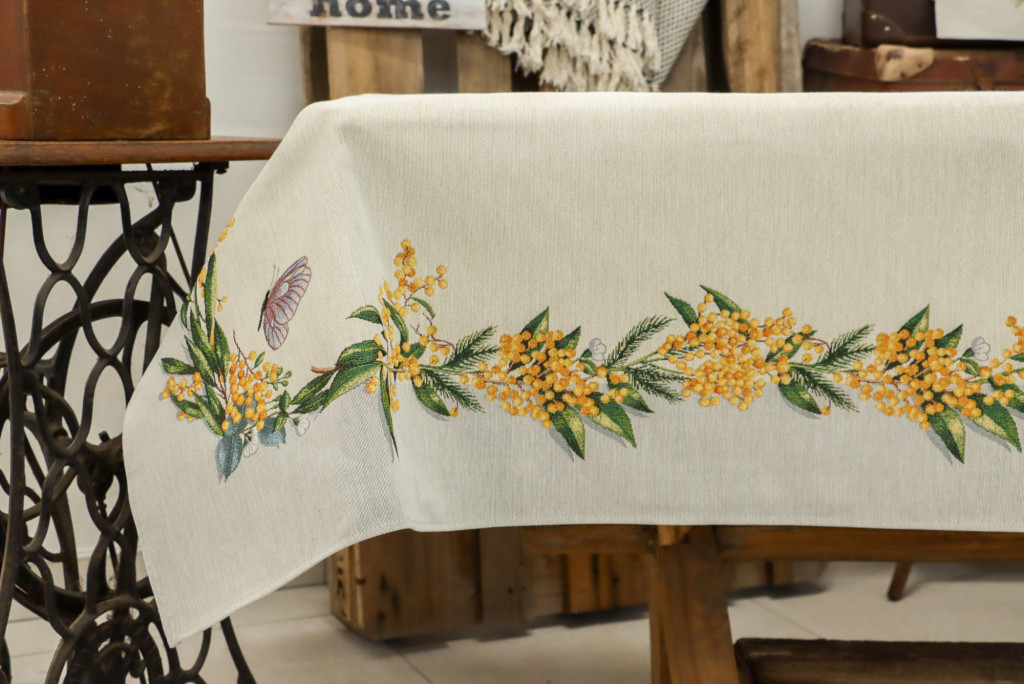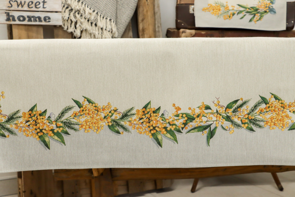 Gyönyörű sárga mimóza virágokkal díszített asztalterítő, amelyet minen alkalommal feltehetsz az étkezőben. Lepd meg magad vagy szeretteidet egy prémium minőségű asztalterítővel!