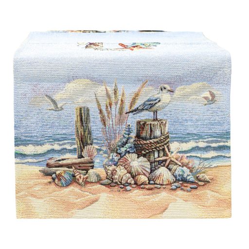 Tengerparti hangulatú, spanyol gobelin asztalterítő kagylókkal, sirályokkal és homokos tengerparttal. Tökéletes nyaralóba, konyhába vagy fedett teraszra.
