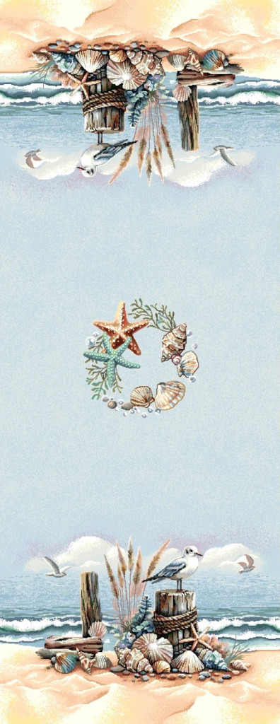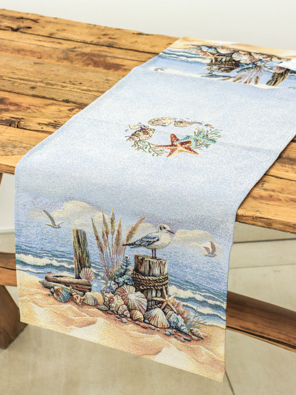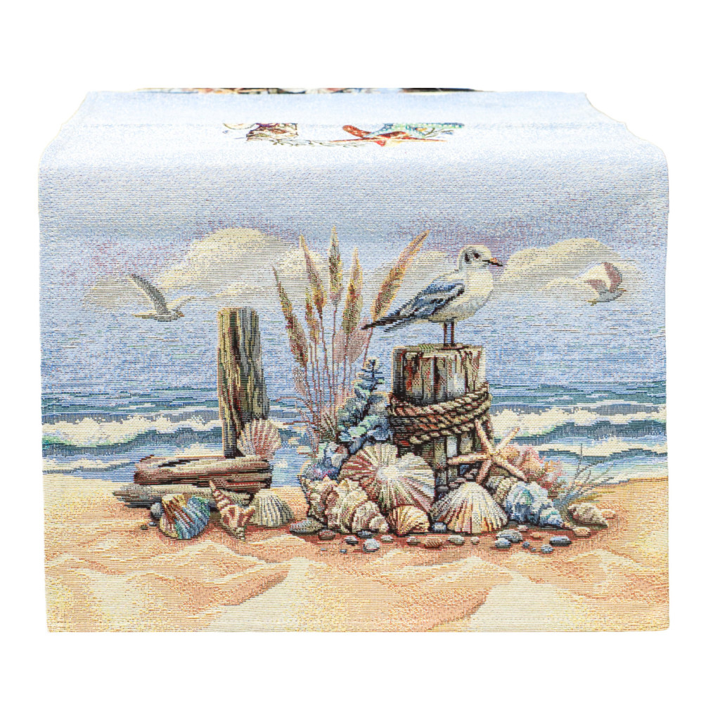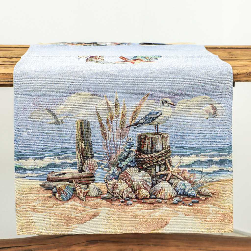 Varázsold az otthonodba a tengerpart békés hangulatát ezzel a gobelin asztali futóval. A futó mintáján finom részletességgel jelennek meg kagylók, tengeri csillagok, sirályok, homokos part és az óceán nyugalmat árasztó hullámai. A világoskék háttér és a természetközeli árnyalatok frissességet visznek bármely enteriőrbe – legyen az egy nyári otthon, egy mediterrán stílusú konyha vagy egy tengerparti nyaraló. Tartós anyaga miatt a futó mindennapi használatra is ideális, ugyanakkor elegáns kiegészítő ünnepi alkalmakra is.