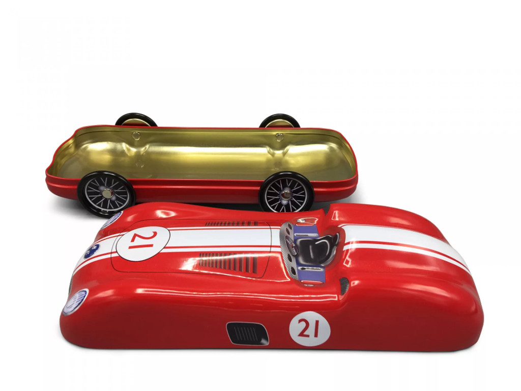 Gondosan megmunkált, klasszikus sportautó alakú fém doboz, forgó kerekekkel. Egyedi formája teszi különlegessé, használható lakásdekorként, de szétszedve mindenféle finomságot is belepakolhatunk. A termék élelmiszerbiztos, így az édesség közvetlenül is belekerülhet. A lakásban igazán exkluzív kiegészítőként mutat.