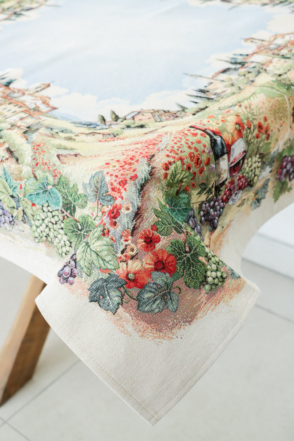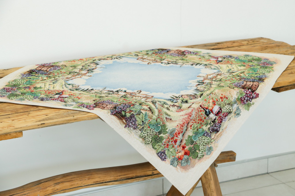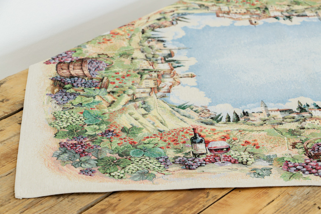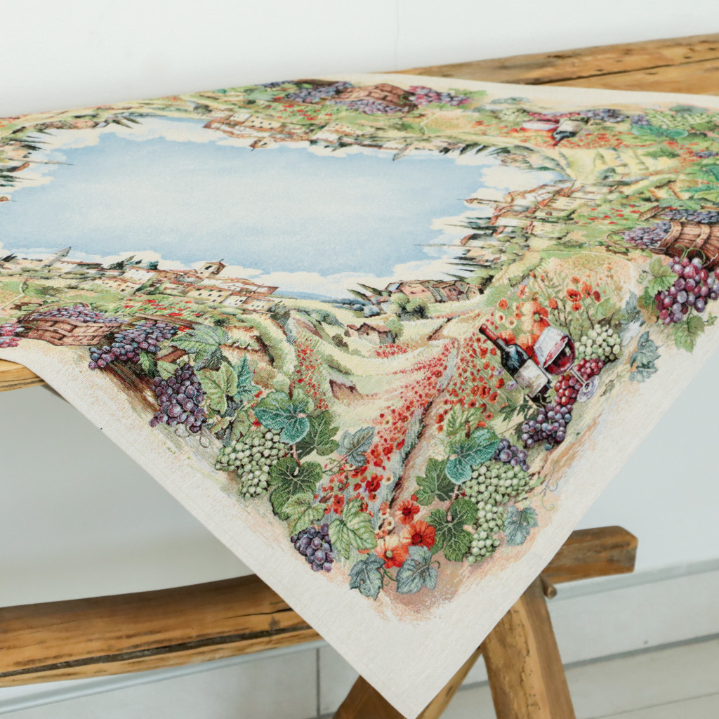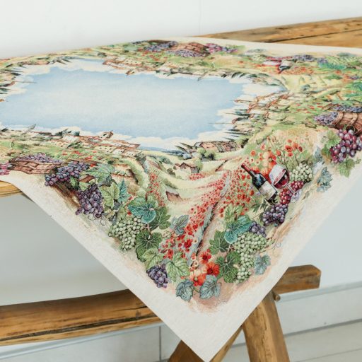 Varázsold otthonodba a toszkán vidék romantikáját ezzel a csodás asztalterítővel! A festői szőlőskertek, napfényes domboldalak és bájos olasz falvak ihlette minta meleg, barátságos atmoszférát teremt minden étkezéshez.