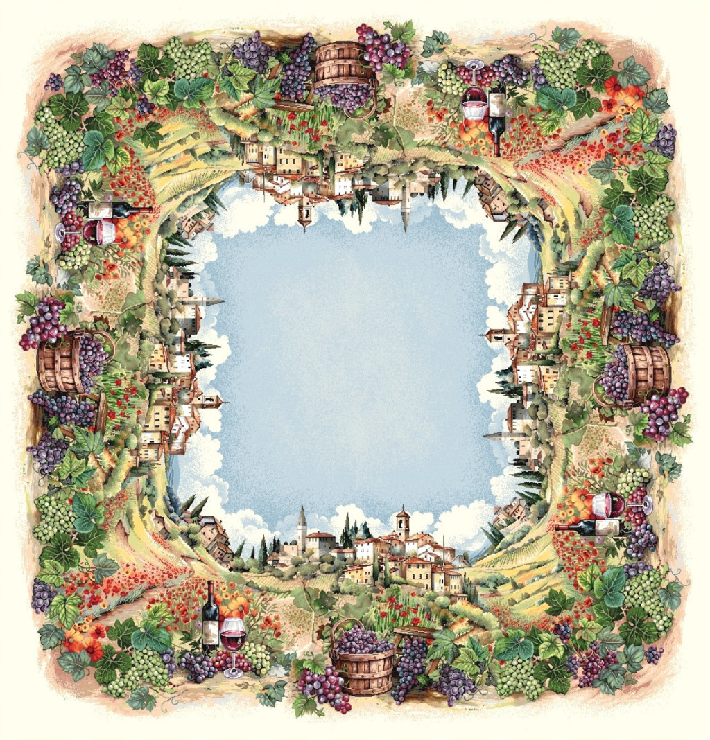 Lenyűgöző Toszkána dizájn – Színes szőlőfürtök, borospalackok és dombos táj elevenedik meg rajta.