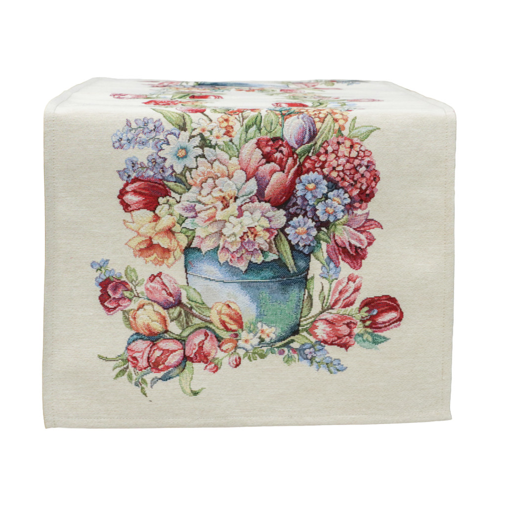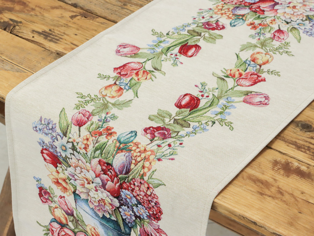 Tavaszias hangulatú, spanyol gépi gobelin asztali futó tulipánokkal és virágcsokorral dekorálva. Elegáns dísze étkezőnek, kávézóasztalnak vagy ünnepi terítésnek.