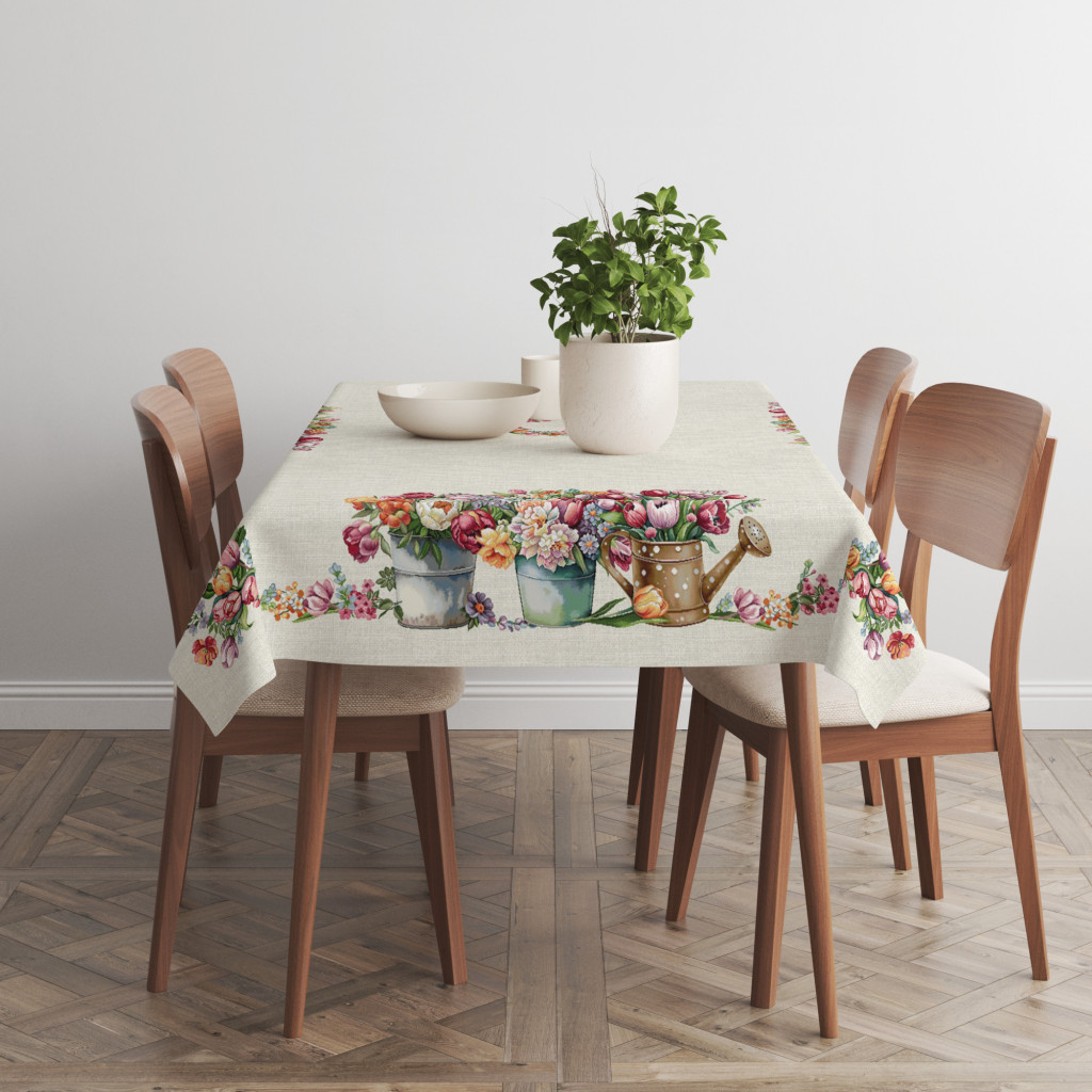 A részletgazdag, virágos minta – tulipánokkal, kerti virágokkal és dekoratív öntözőkannás motívumokkal – romantikus, vintage kert hangulatot kölcsönöz az étkezőnek.