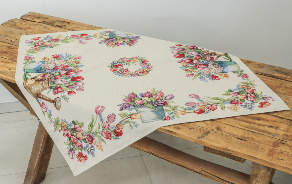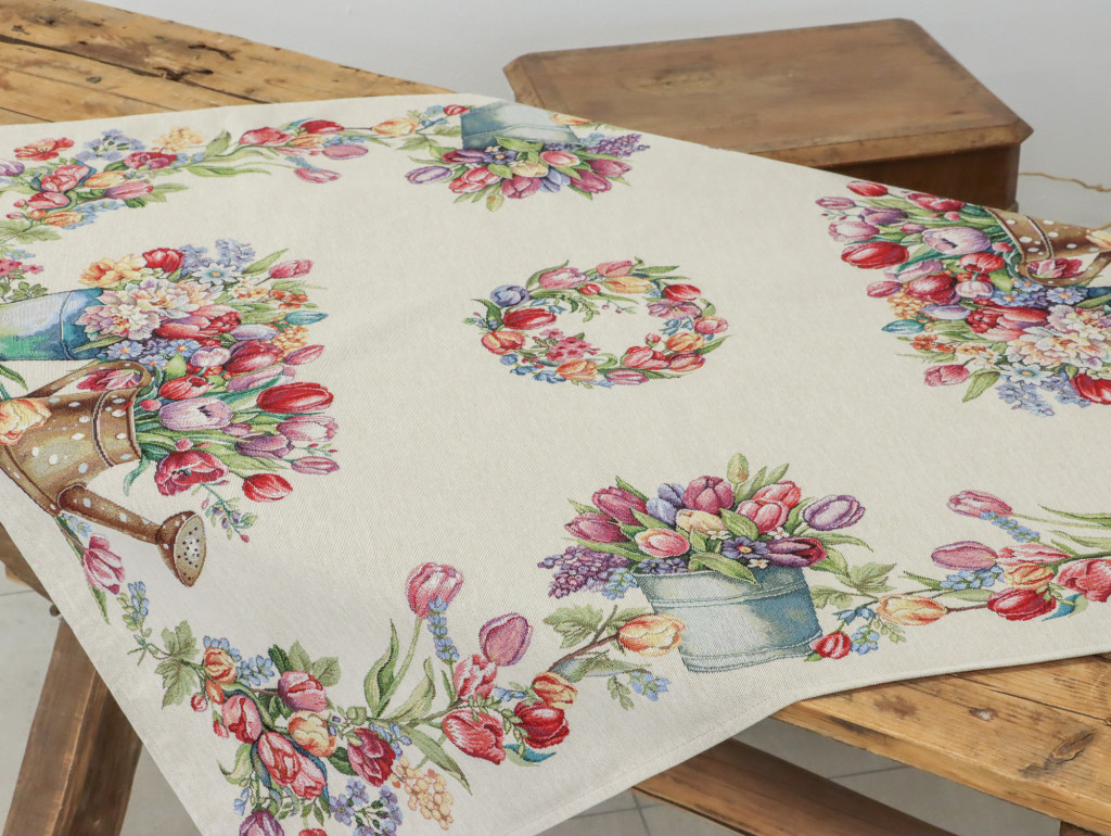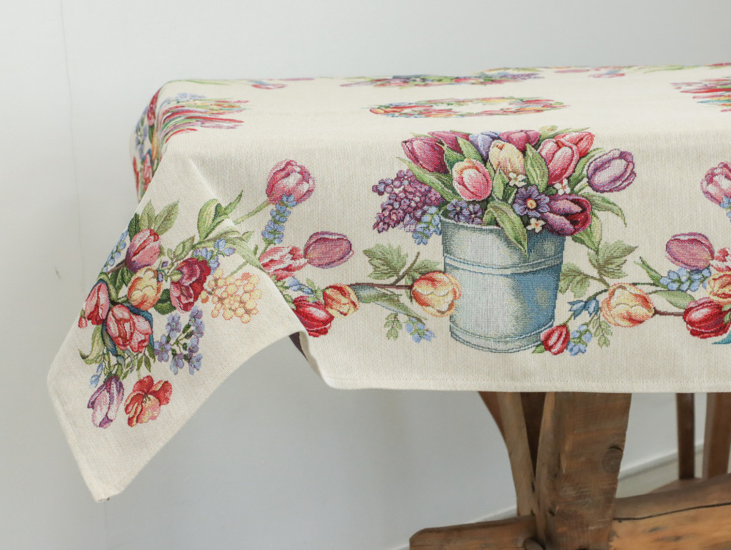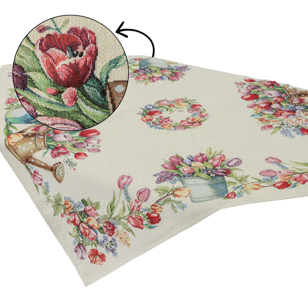 Tavaszias hangulatú, spanyol gépi gobelin asztalterítő tulipánokkal és virágcsokorral dekorálva. Elegáns dísze étkezőnek, kávézóasztalnak vagy ünnepi terítésnek.