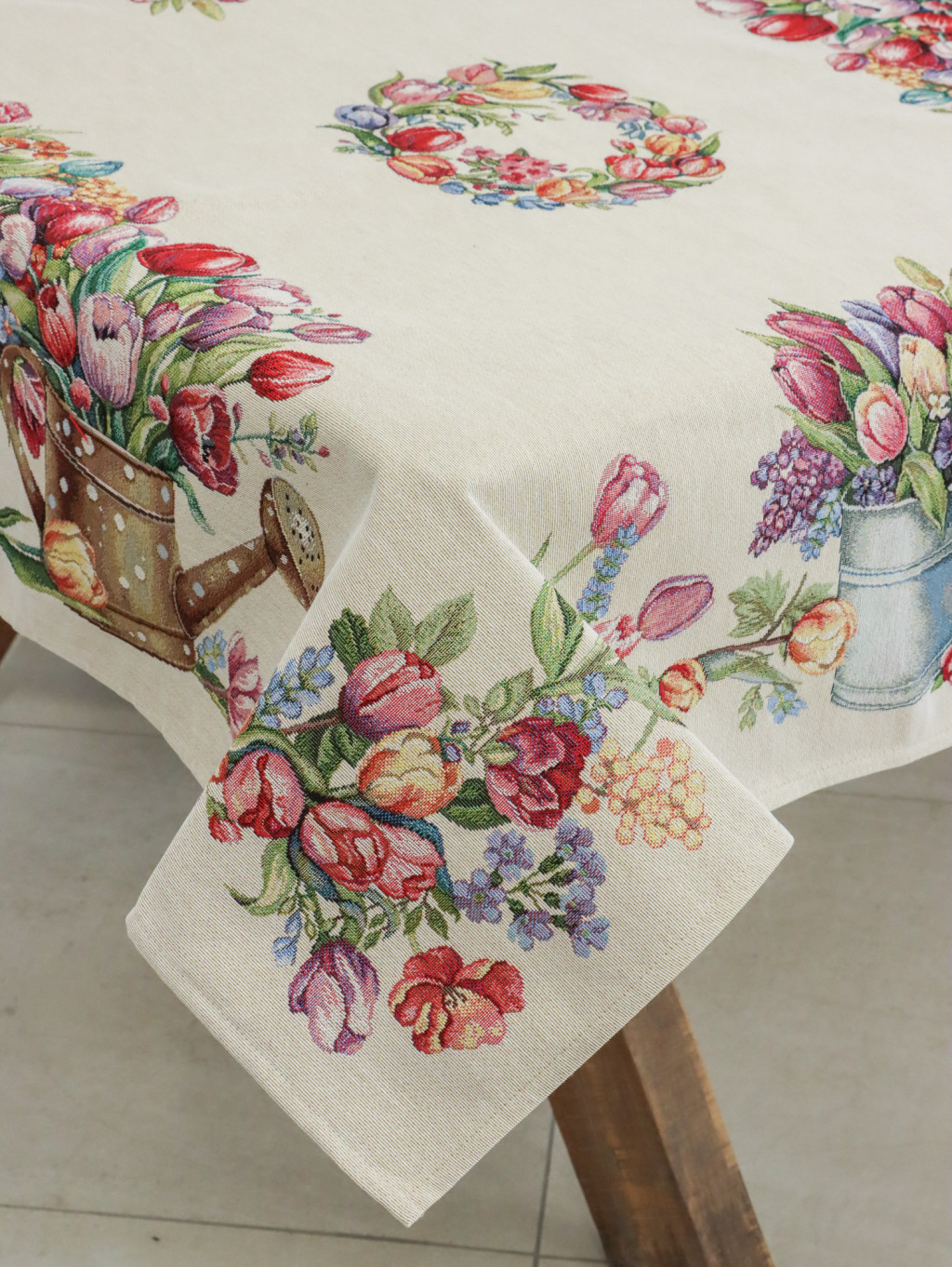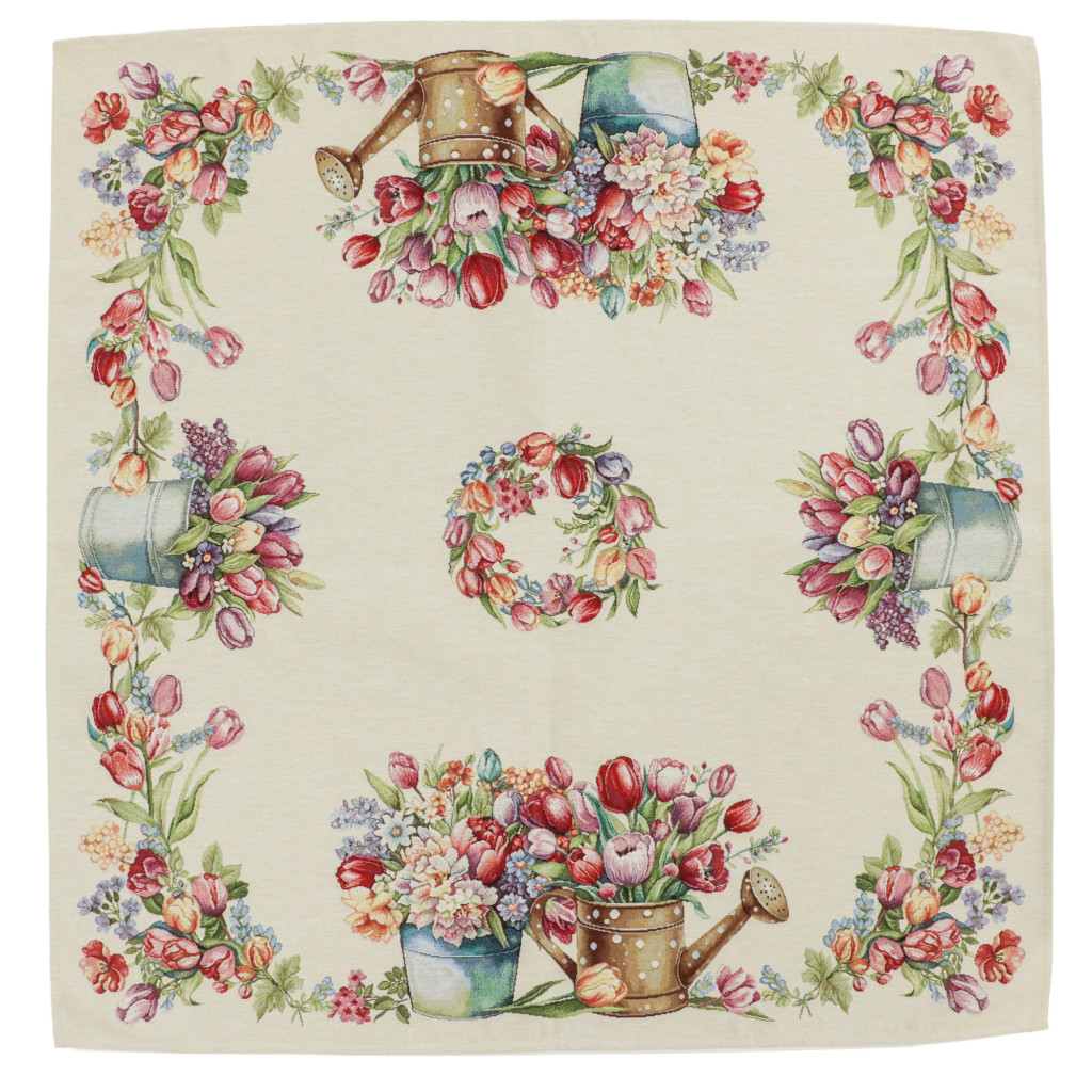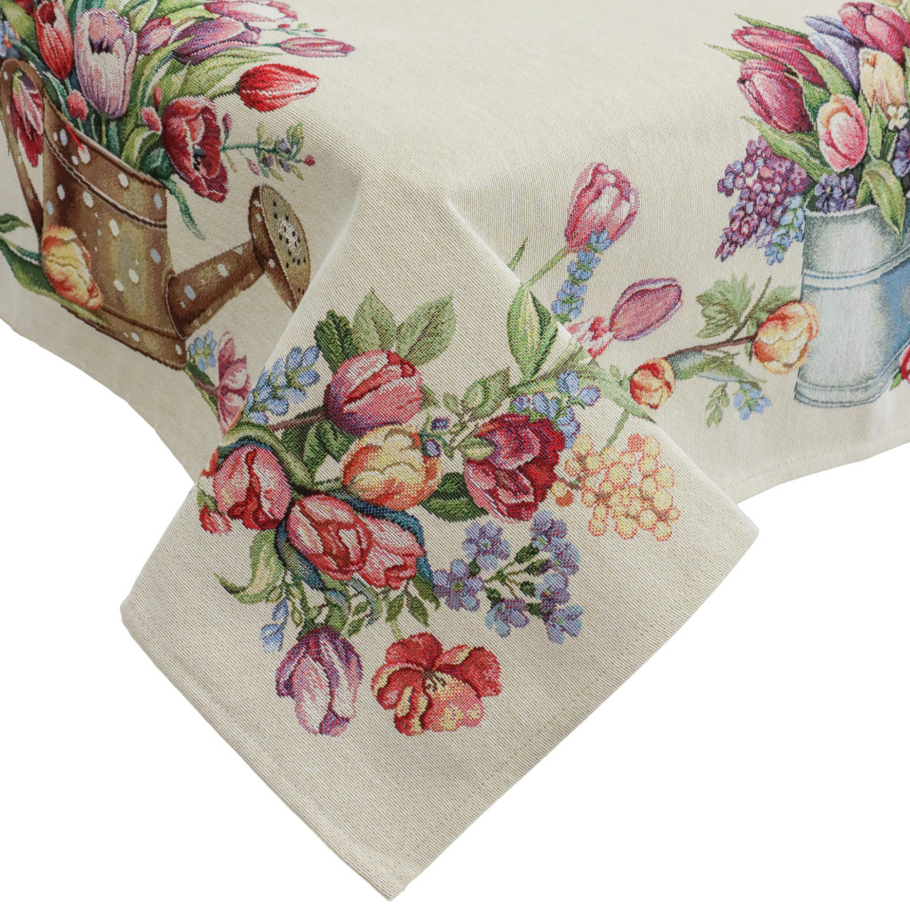 Tavaszias hangulatú, spanyol gépi gobelin asztalterítő tulipánokkal és virágcsokorral dekorálva. Elegáns dísze étkezőnek, kávézóasztalnak vagy ünnepi terítésnek.