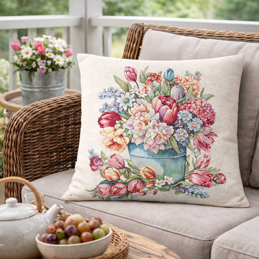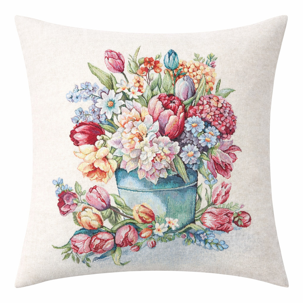Spanyol gobelin párnahuzat – tulipános, virágos kerti mintával
