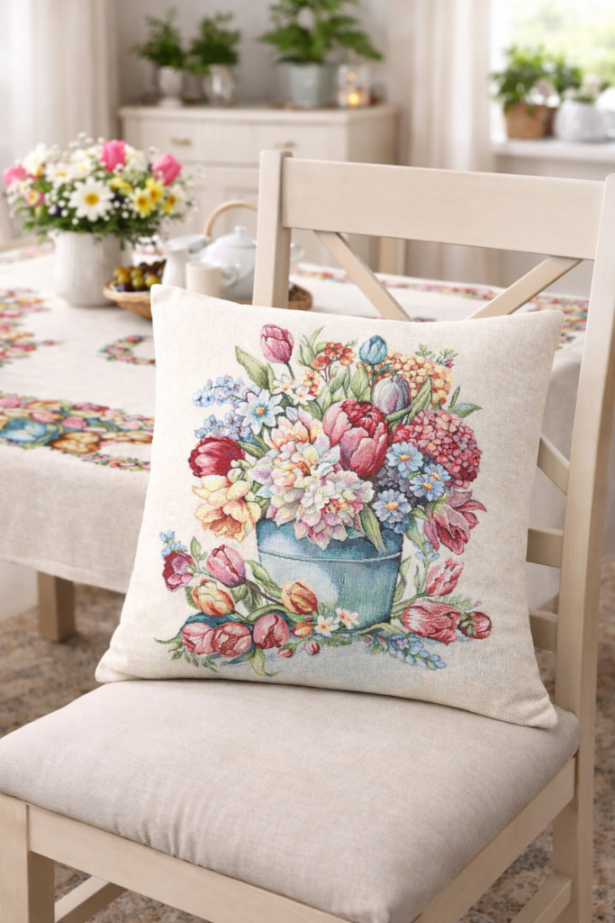 Prémium minőségű, gépi szövésű spanyol gobelin párnahuzat, romantikus tulipáncsokorral és dekoratív öntözőkanna motívummal. A természetes, pasztell árnyalatok meghitt, tavaszias hangulatot teremtenek a nappaliban vagy hálószobában. Vastag, strapabíró anyag, amely hosszú távon is megőrzi szépségét. A párna mindkét oldalán ugyanaz a minta található, cipzár a huzat alján van.