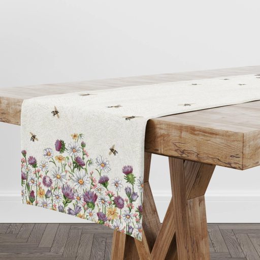 Töltsd meg otthonod a természet bájával ezzel a gépi szövésű gobelin asztali futóval! A virágzó rét hangulatát idéző, részletgazdag vadvirágok és játékosan röpködő méhecskék elevenítik meg a tavaszi mező érzését. Az élénk színek és a finoman texturált anyag egyaránt eleganciát és vidámságot visznek az étkezőasztalra.