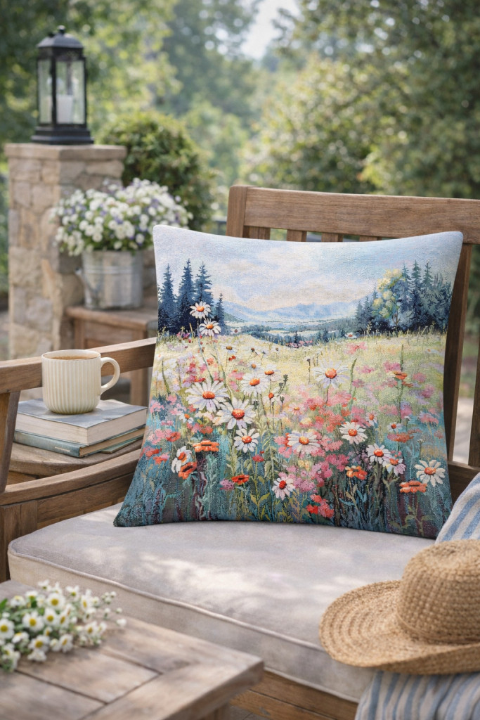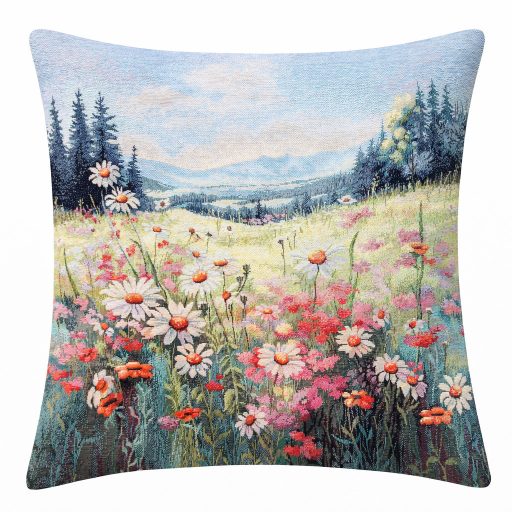 Ez a különleges, gépi szövésű spanyol gobelin díszpárna huzat egy festői vadvirágos mezőt ábrázol, amely a távolban hegyekbe és fenyőerdőbe simul. A romantikus hangulatú tájkép finom pasztellkék égbolttal, margarétákkal, pipacsokkal és lágy zöld árnyalatokkal teremt természetközeli, nyugodt atmoszférát otthonodban.