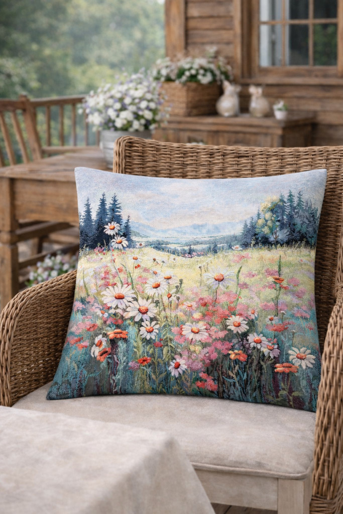 Hangulatos vadvirágos mezőt és hegyvidéki tájat ábrázoló prémium minőségű spanyol gobelin díszpárna huzat. A részletgazdag szövött minta természetes, harmonikus színeivel tökéletes választás nappaliba, teraszra vagy vidéki stílusú enteriőrbe. Kétoldalas minta, cipzár a huzat alján található.