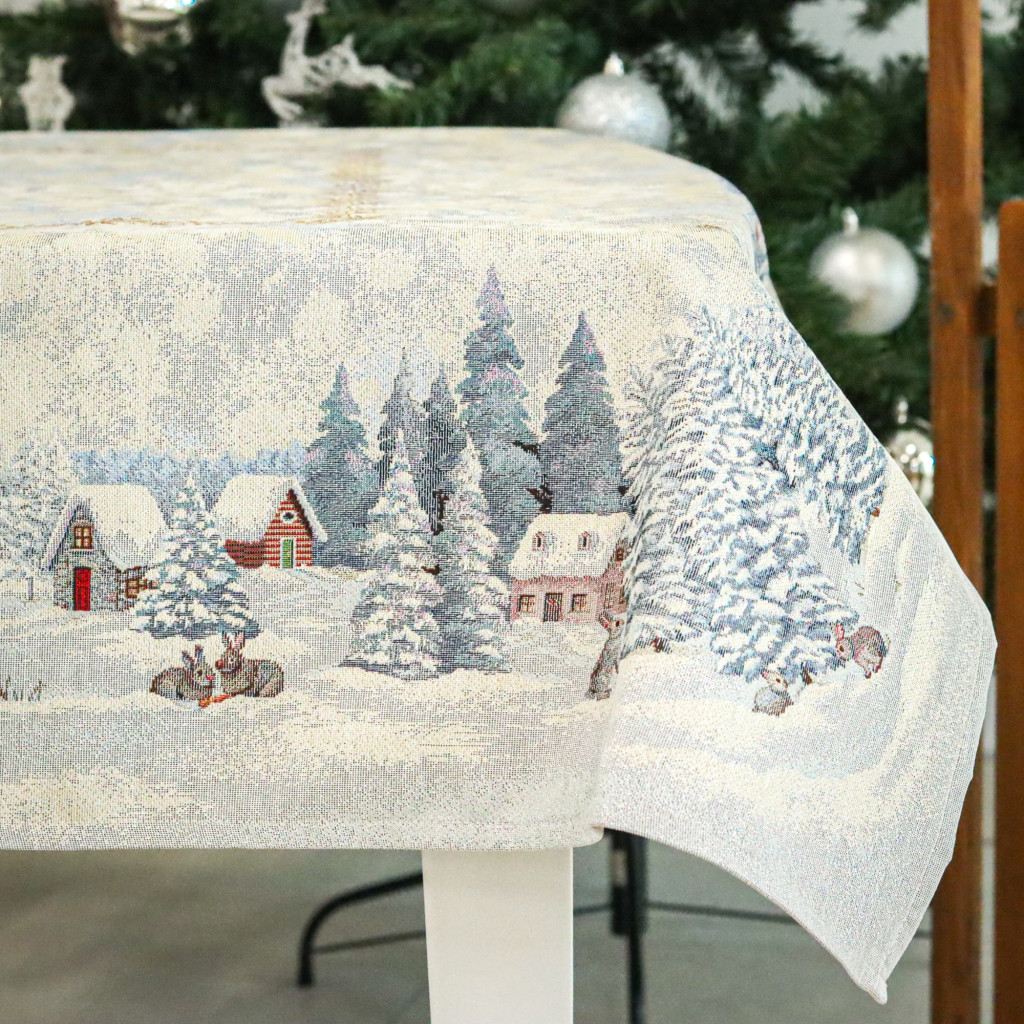 White forest nyuszik a hóban asztalterítő, 137x180 cm, ezüst lurex