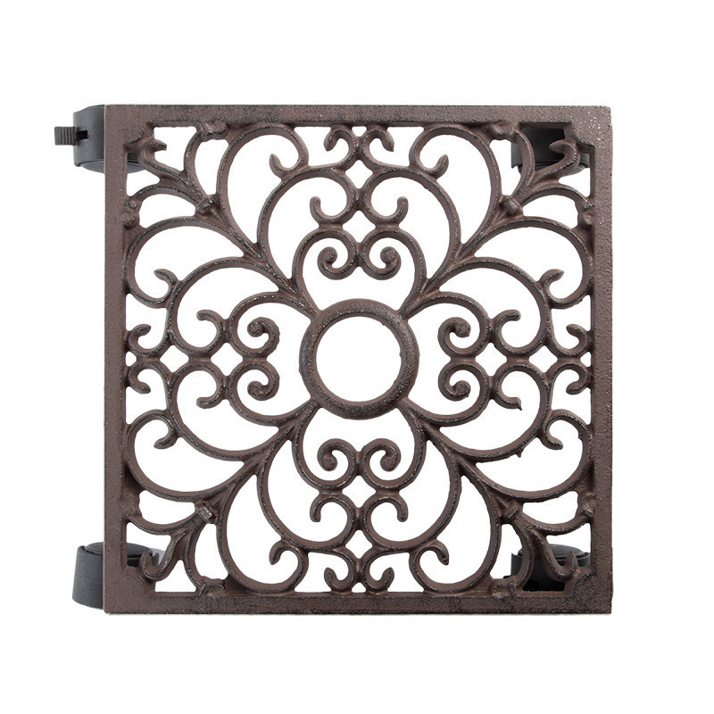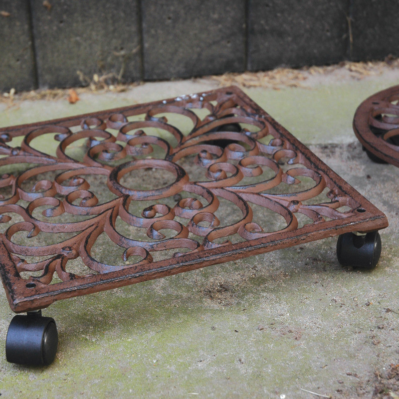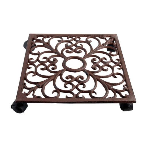 Klasszikus mintájú, négyzet alakú öntöttvas, gurulós virágcseréptartó. Helyezzük rá nagyobb méretű virágainkat és a négy műanyag kerék segítségével könnyen mozgathatjuk őket. Praktikus és stílusos kellék. Öntöttvas jellegéből adódóan külső elhelyezés esetén, a korrózió megjelenésével egy patinásabb, rusztikusabb termék válik belőle.
