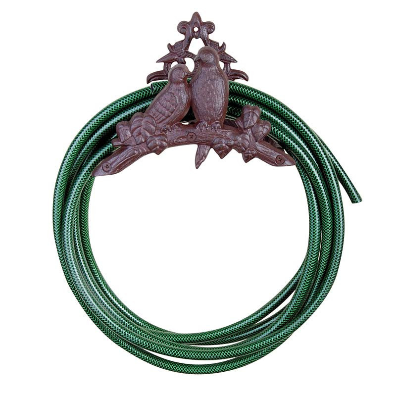 Rusztikus stílusú öntöttvas kerti tömlőtartó kismadár mintával. Különleges megjelenésű darab, amely pompásan mutat minden udvarban. Használat után mindig tekerjük rá vissza a locsolótömlőt, így sosem lesz útban. Öntöttvas jellegéből adódóan külső elhelyezés esetén, a korrózió megjelenésével egy patinásabb, rusztikusabb termék válik belőle. A termék antik barna színben kapható, a falra könnyen felszerelhető.TIPP: A felszereléshez szükséged lesz az ehhez megfelelő kiképzésű csavarra is. A termék a csavart nem tartalmazza.