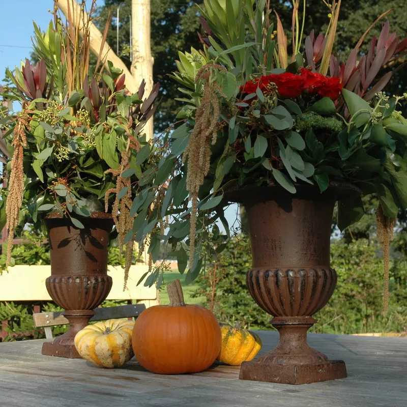 Francia stílusú, öntöttvas talpas kehely, amely kertünk pompás dekorációja lehet. Ültessünk bele virágokat és tegyük udvarunk különböző pontjaira. A termék antik barna színben kapható, időtálló anyagból készült. Öntöttvas jellegéből adódóan külső elhelyezés esetén, a korrózió megjelenésével egy patinásabb, rusztikusabb termék válik belőle.