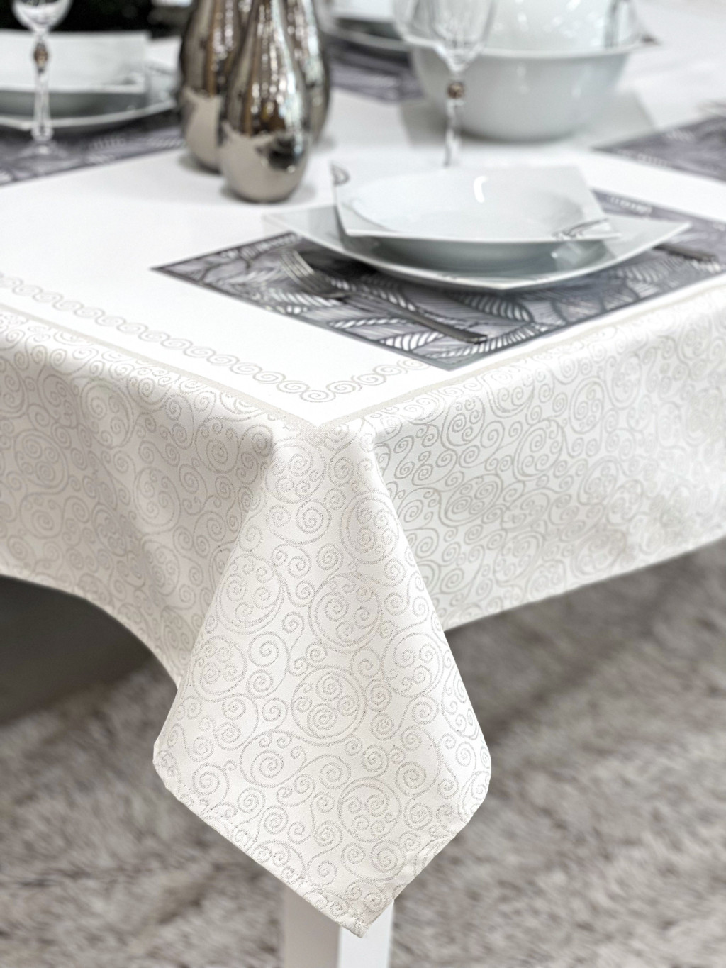 Ünnepi asztalterítő ezüst lurex szövéssel, a szélén karácsonyfákkal dekorálva, amely eleganciát kölcsönöz az asztalnak. Ideális választás egy elegáns ebédhez, különleges alkalmakra, esküvőre, karácsonyra egyaránt.