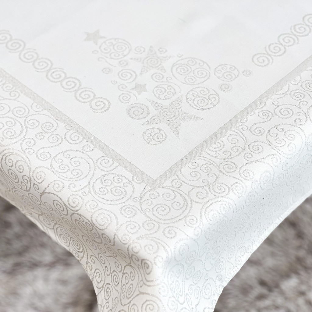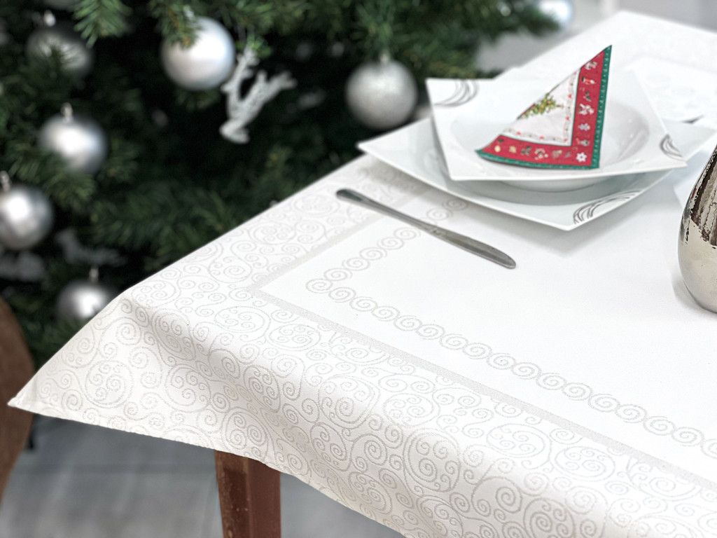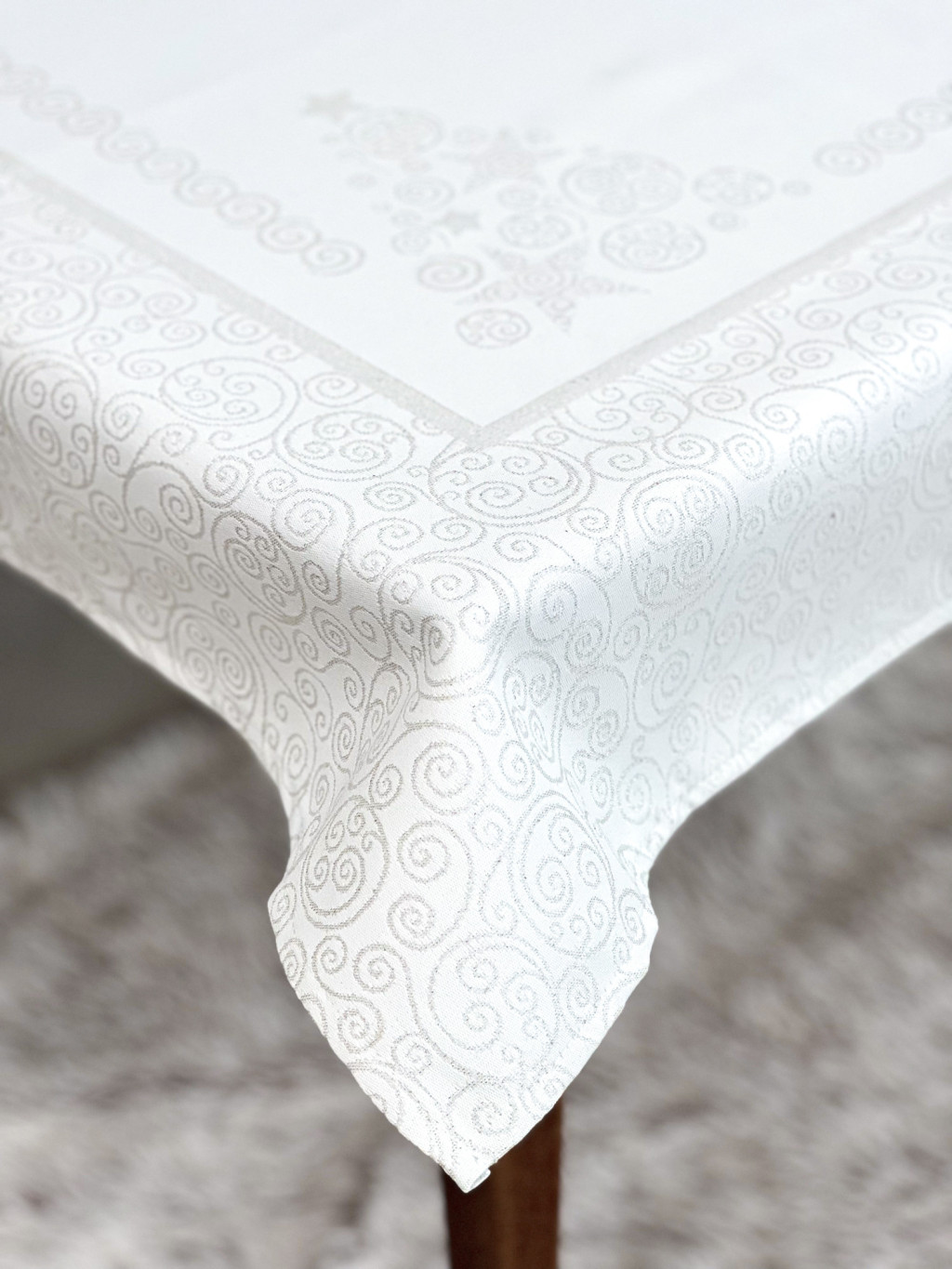 Dobd fel étkeződ vagy ünnepi asztalod megjelenését ezzel a lenyűgöző ezüst lurexes asztalterítővel, amely elegáns mintázattal büszkélkedhet és csillogó hatást kelt. A mintázatot finoman kidolgozott, ezüstszínű karácsonyfa díszíti a terítő két sarkán, míg a szélen apró, ezüstös csigavonalas minta látható. Ideális választás egy elegáns ebédhez, különleges alkalmakra, esküvőre, karácsonyra egyaránt.