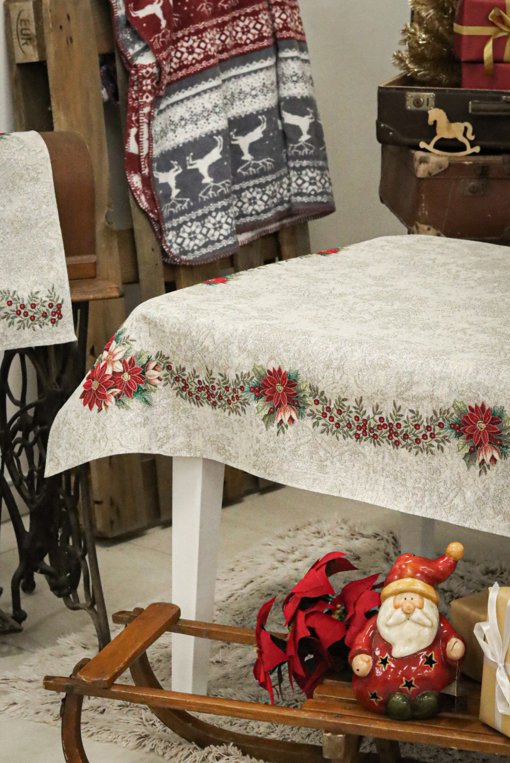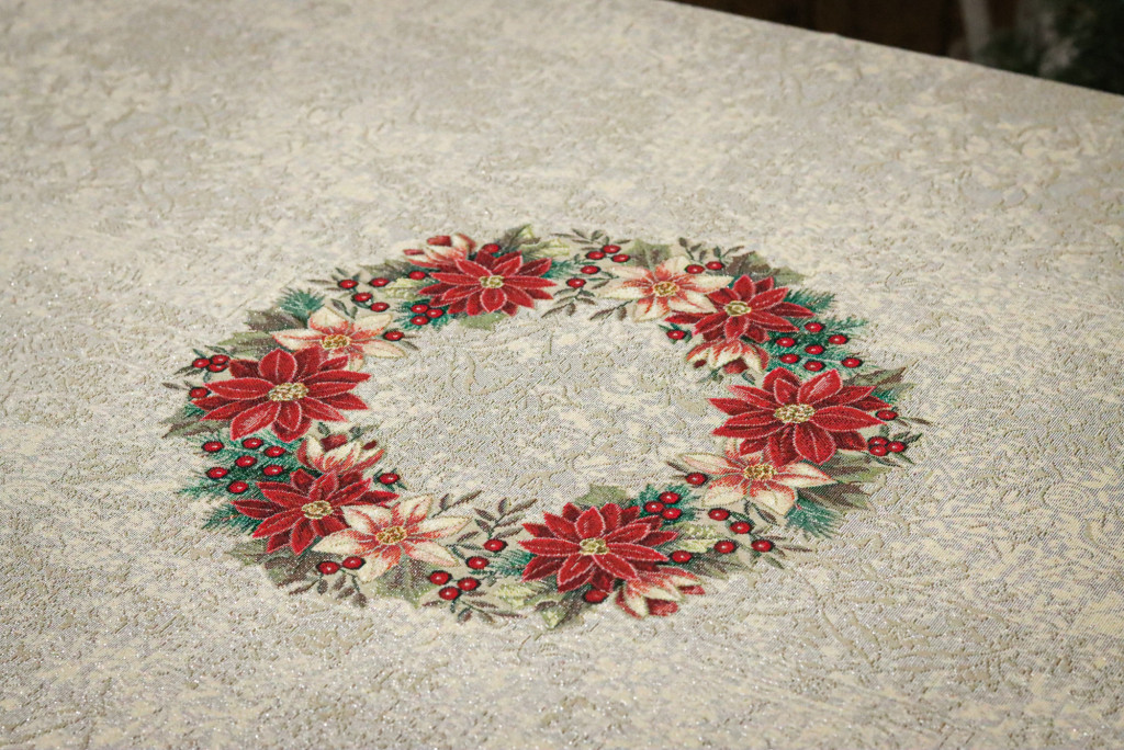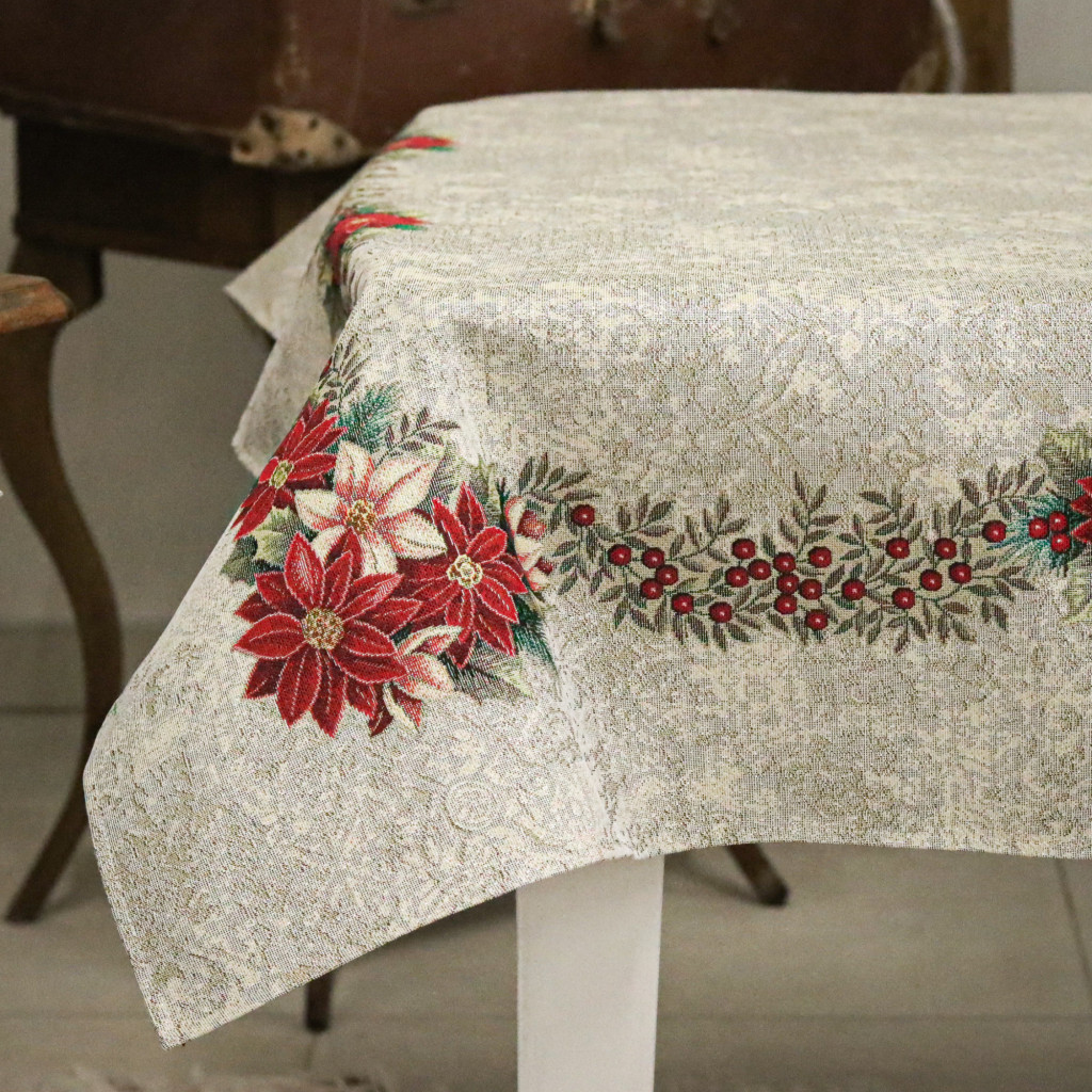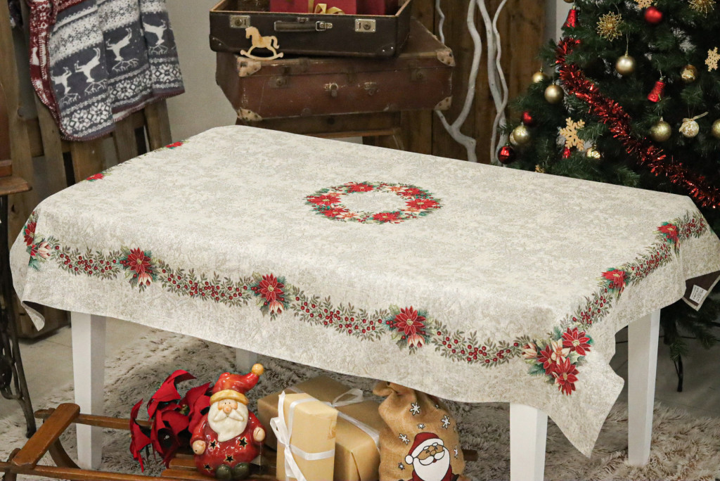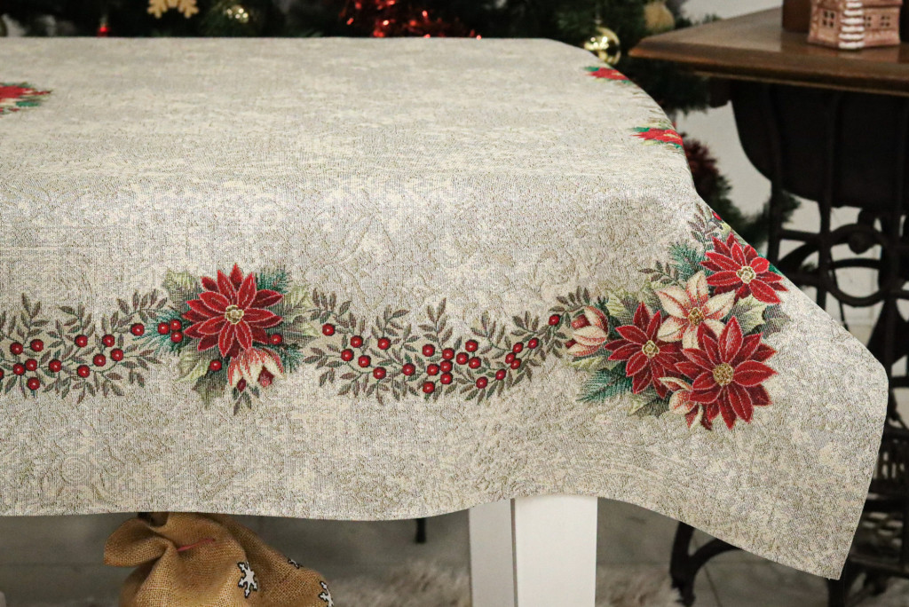 Nikolaus mikulásvirágos kollekció asztalterítő ezüst lurexes szövéssel. Ez a terítő gyönyörűen mutat az ünnepi asztalon, csillogása feldobja a karácsonyi étkezéseket. Megfelelő kezelés mellett hosszú éveking megőrzi szépségét és minőségét.