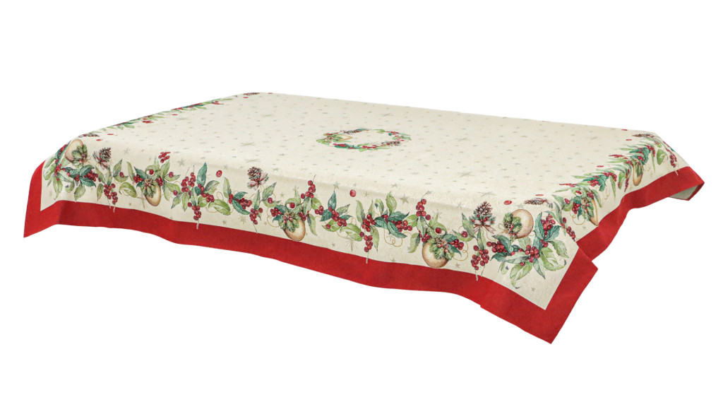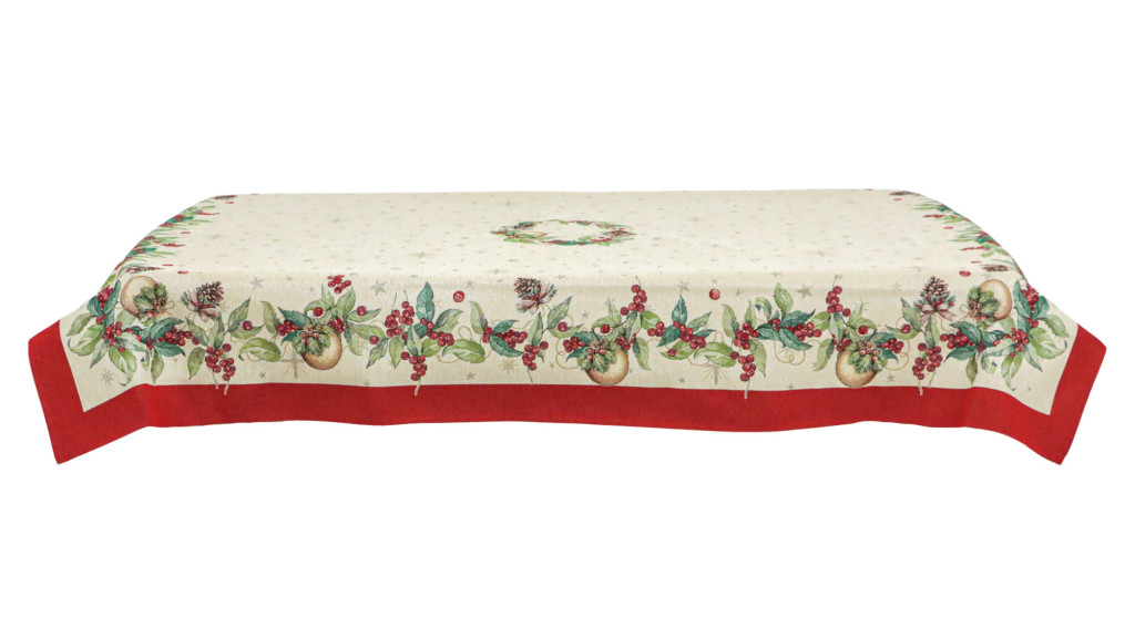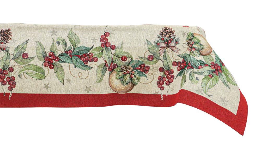 A Berry kollekció asztalterítője kiváló választás karácsonyi vacsorákhoz, családi összejövetelekhez vagy akár ajándékként is remek ötlet lehet. Minőségi anyaga biztosítja, hogy az ünnepek hosszú éveken át emlékezetesek legyenek. A széleket fenyőtobozok, piros bogyók, zöld levelek és aranyszínű karácsonyfadíszek díszítik, amelyeket piros keret vesz körül. A természetes ünnepi elemek harmóniája tökéletesen kiegészíti az ünnepi dekorációkat, megteremtve a karácsony varázslatos hangulatát.