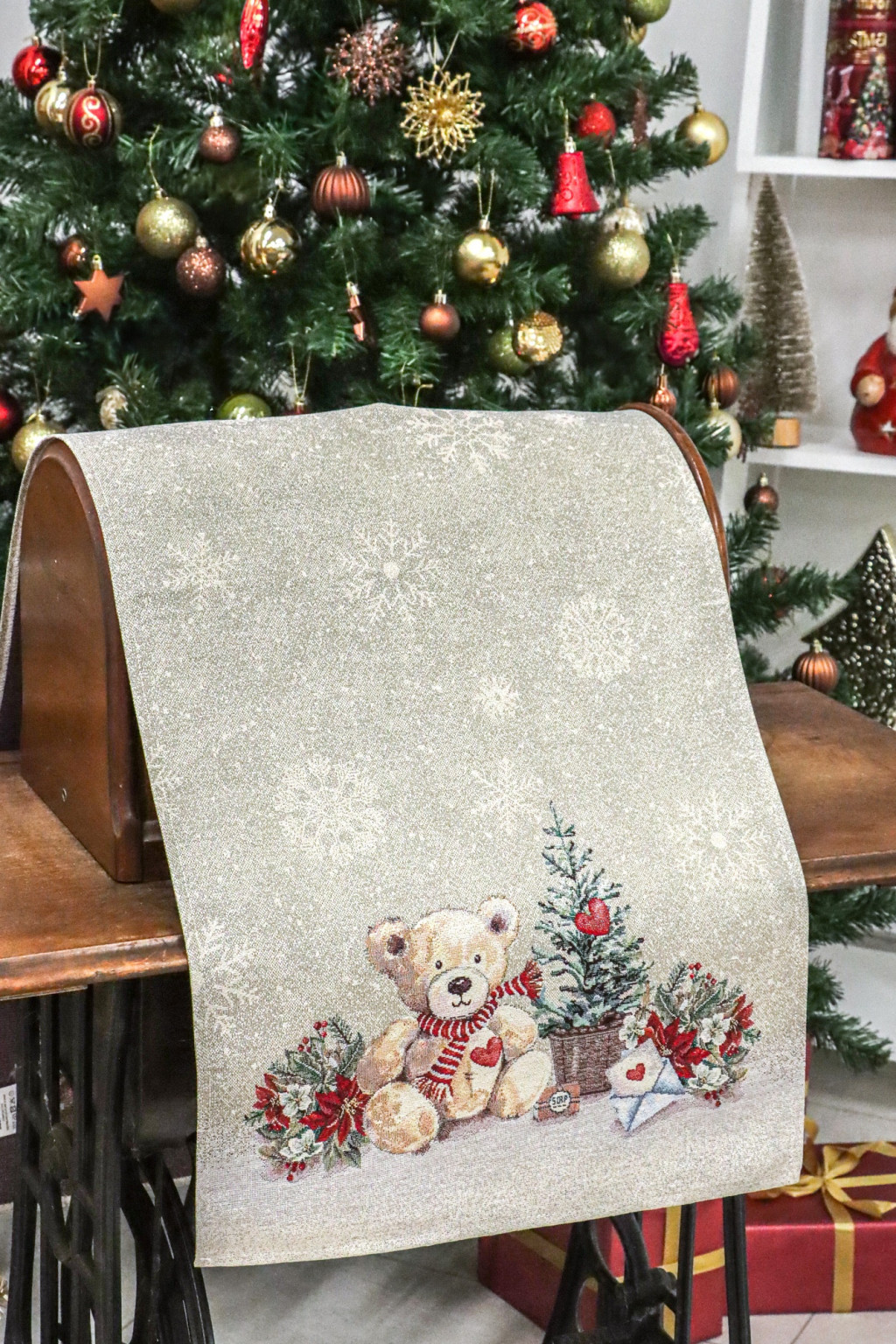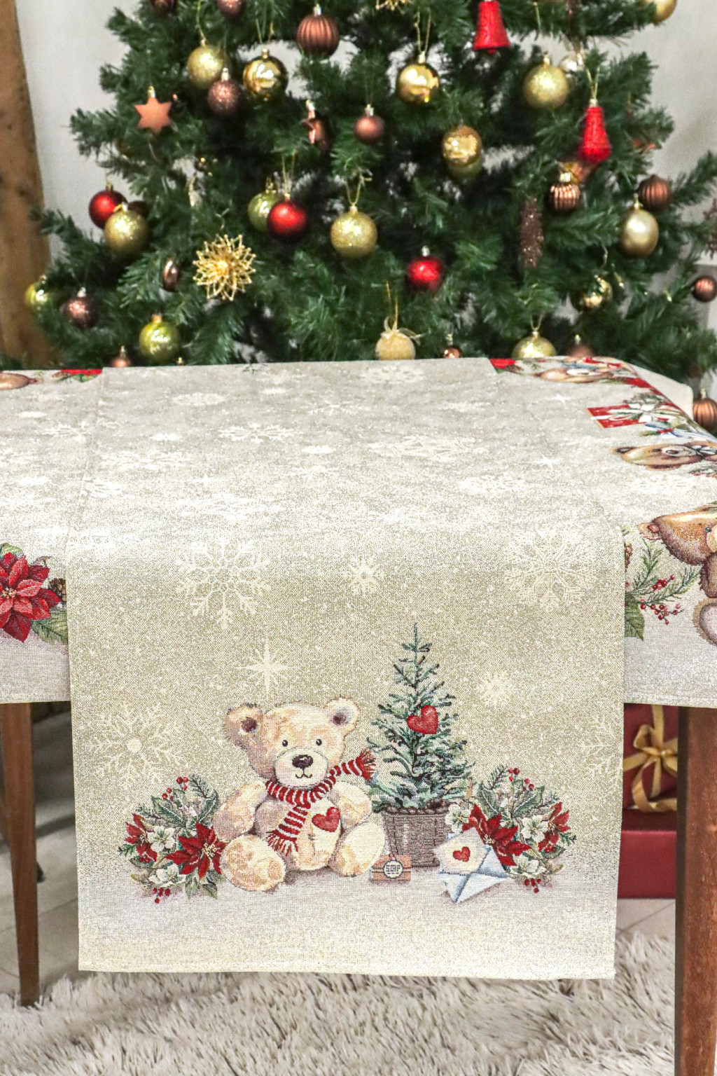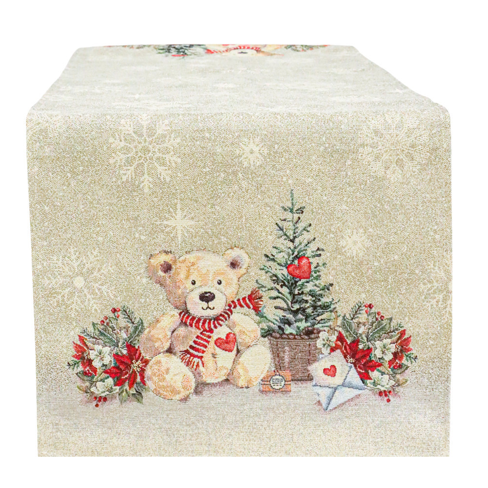 Ez a bájos karácsonyi asztali futó tökéletes választás azoknak, akik különleges karácsonyi élményt szeretnének nyújtani vendégeiknek. A futót két végén cuki mackók, fenyőágak és piros mikulásvirágok díszítik, amelyek meleg és meghitt hangulatot varázsolnak az asztal köré. Az asztali futó közepén hópehely minták találhatók, amelyek az ünnepi tél varázsát idézik.