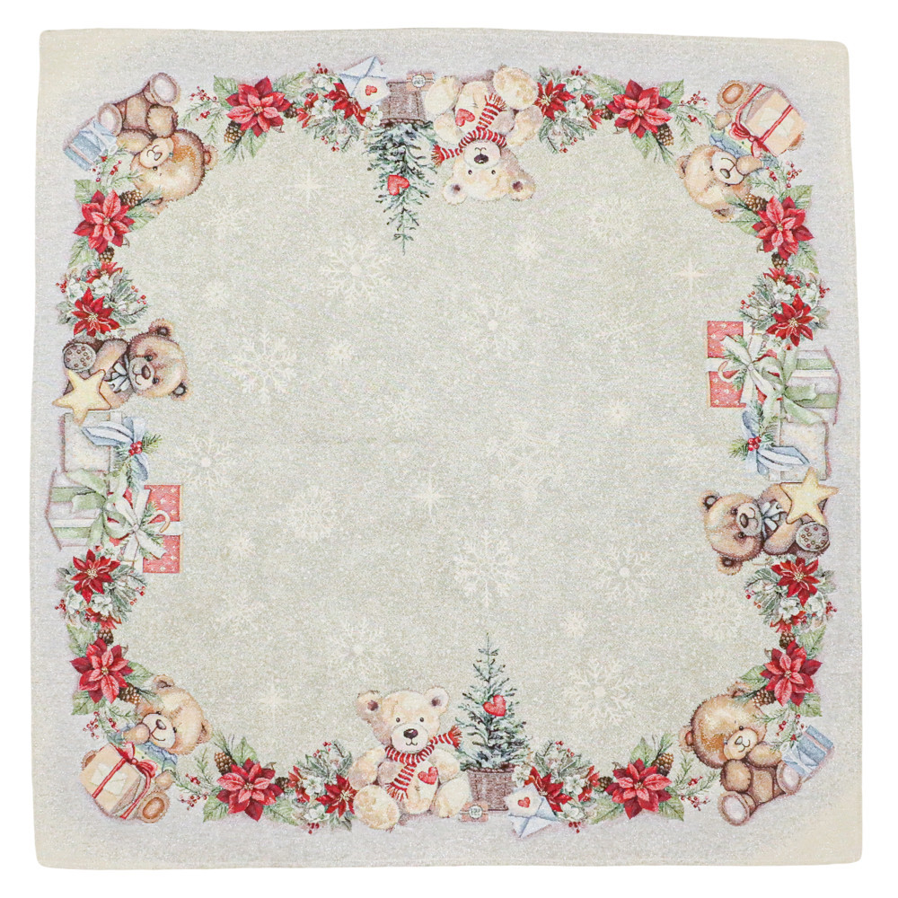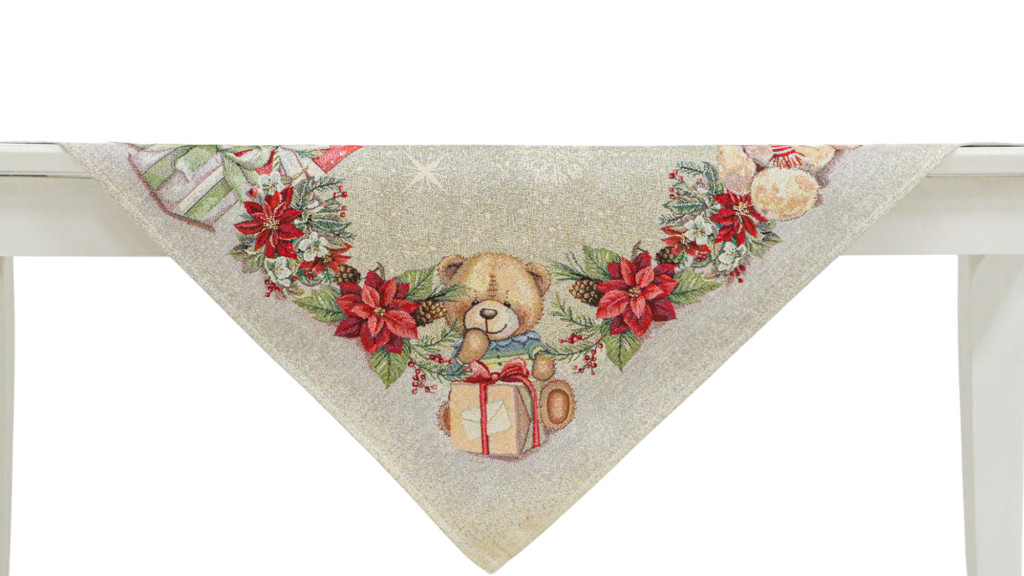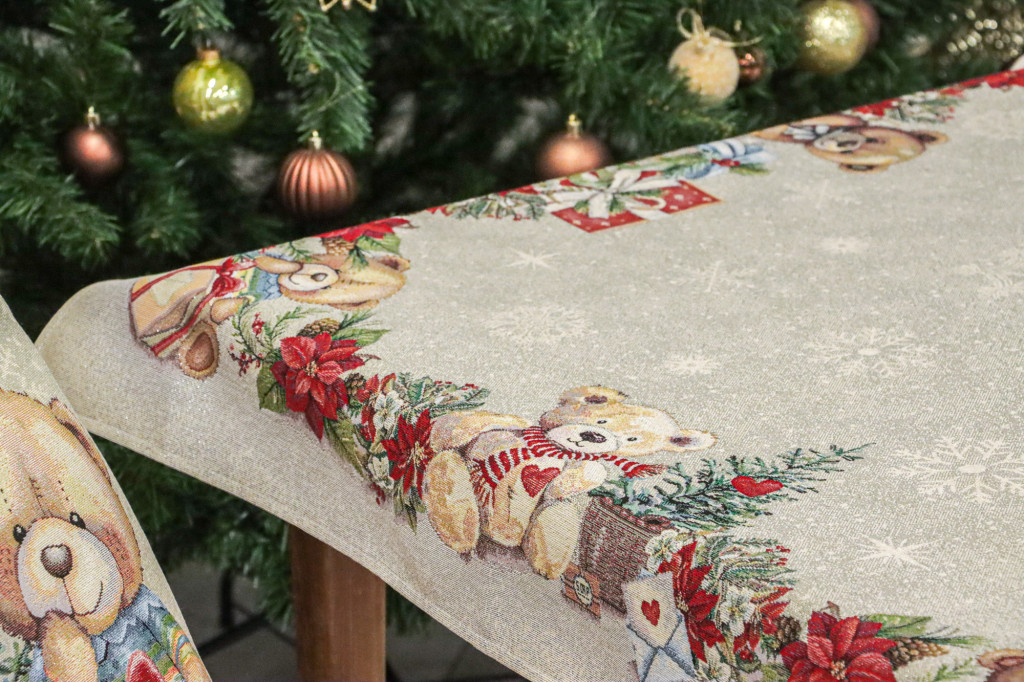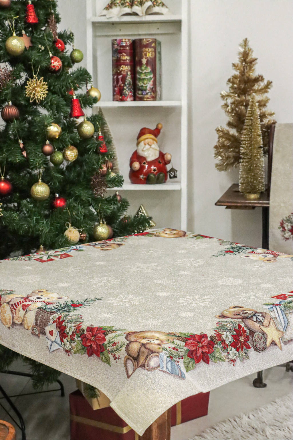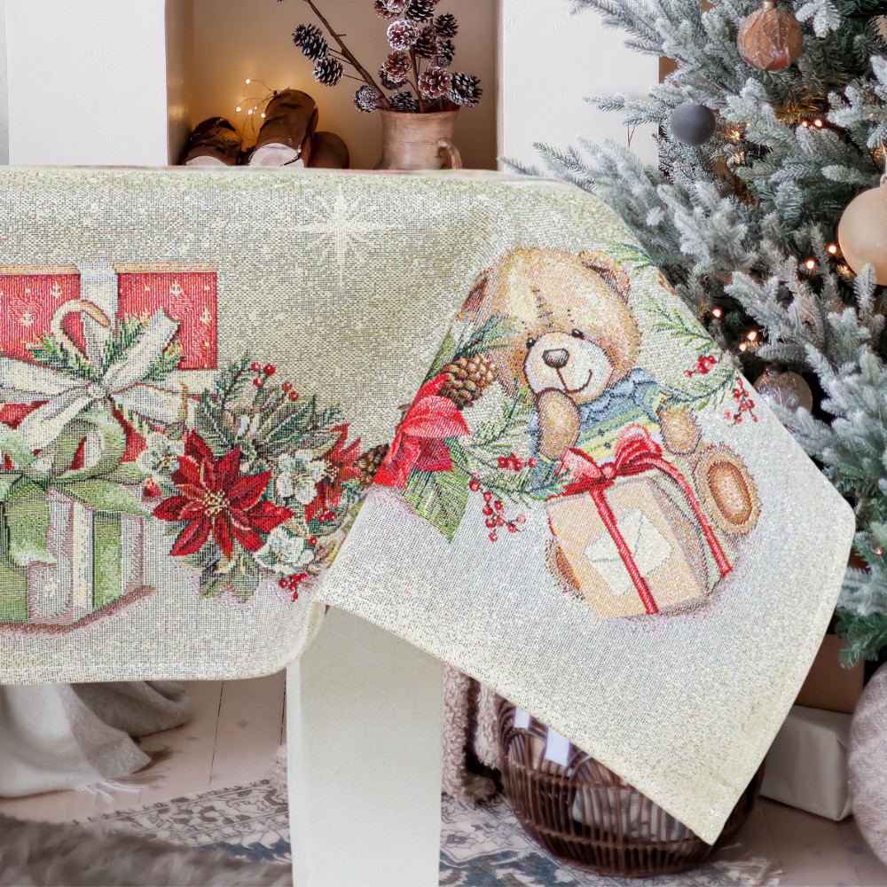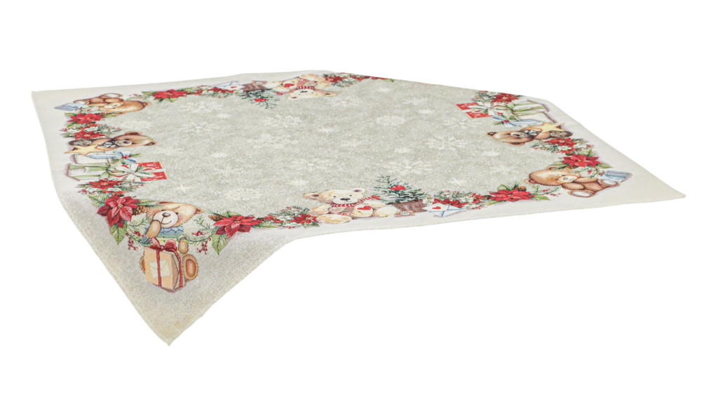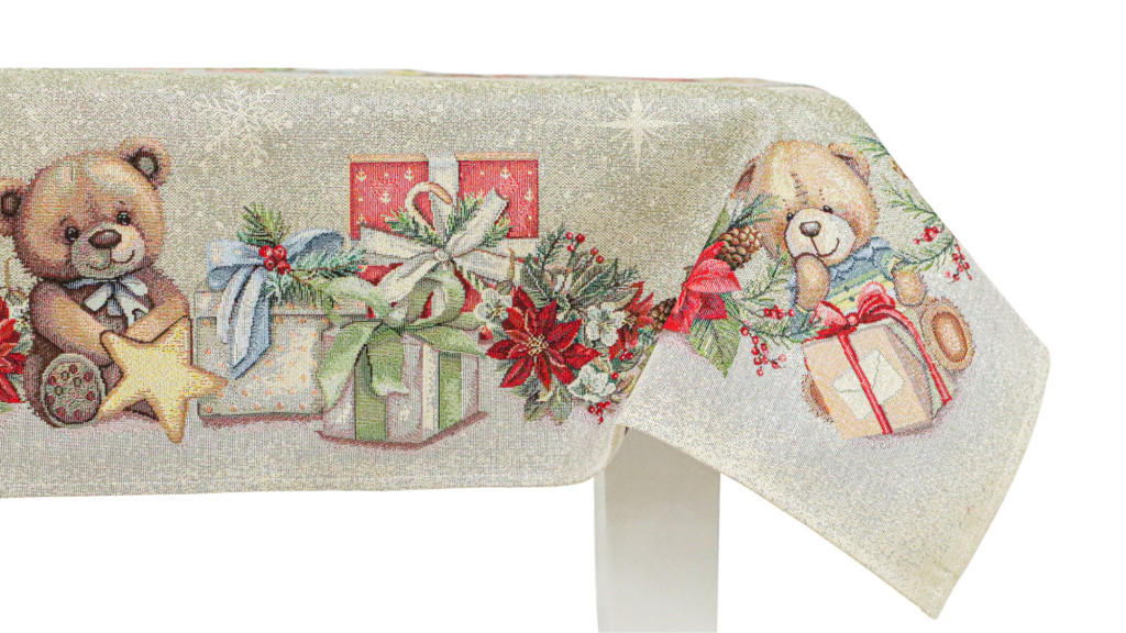 Ez a bájos karácsonyi asztalterítő tökéletes választás azoknak, akik különleges karácsonyi élményt szeretnének nyújtani vendégeiknek. A terítő szélein cuki mackók, ajándékdobozok, fenyőágak és piros mikulásvirágok díszítik, amelyek meleg és meghitt hangulatot varázsolnak az asztal köré. Az asztalterítő közepén hópehely minták találhatók, amelyek az ünnepi tél varázsát idézik.