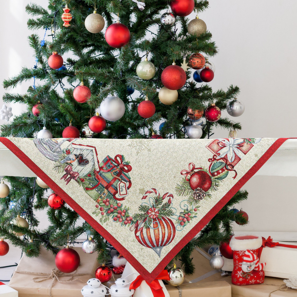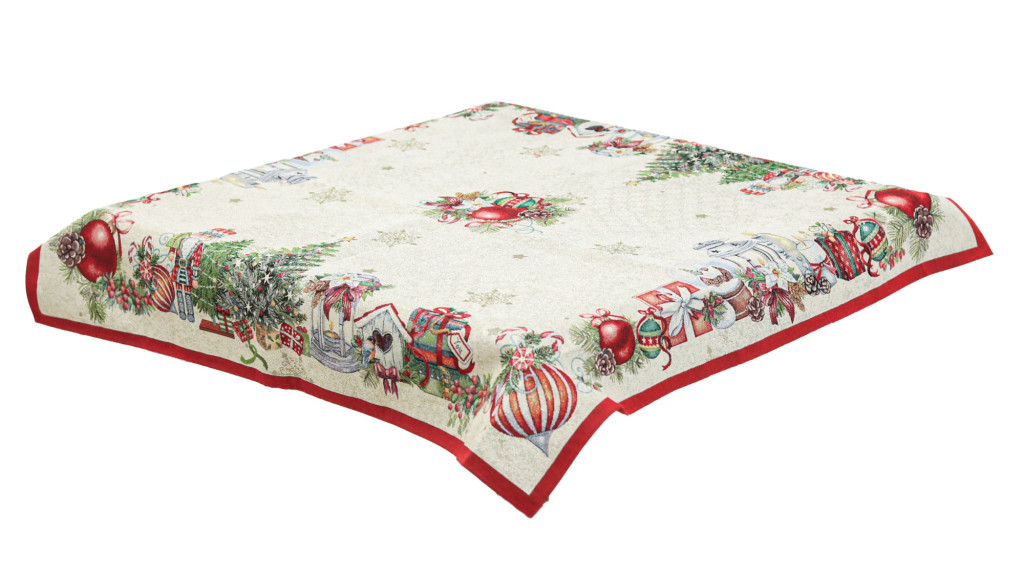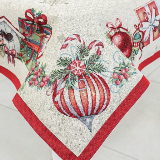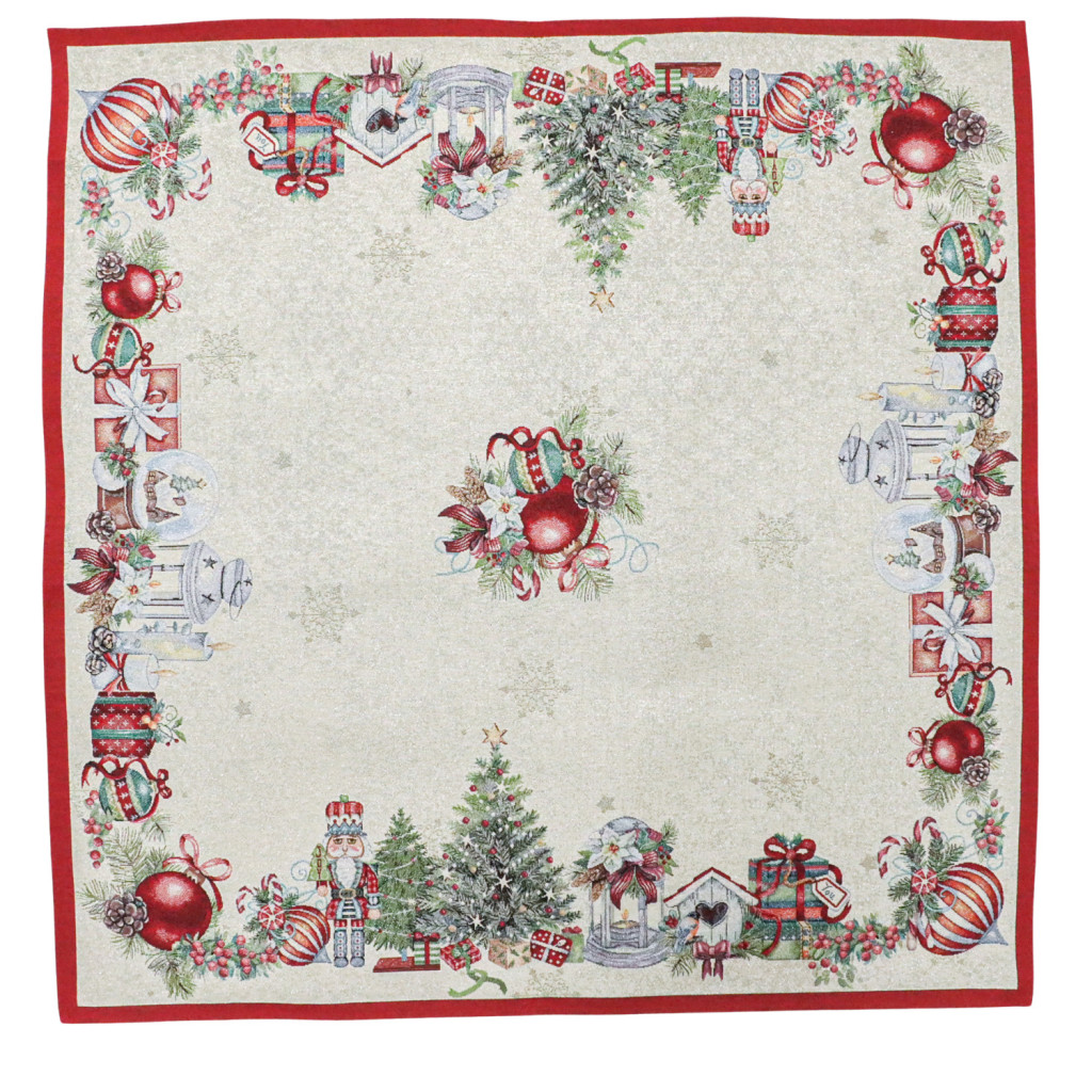 Diótörőkkel, karácsonyfákkal, hógömbökkel és díszekkel dekorált karácsonyi asztalterítő. Anyaga vastag gépi gobelin, ezüst lurexes csillogása teszi igazán ünnepi hangulatúvá. Prémium minőségű termék, amely pompásan mutat az ünnepi asztalon. Megfelelő kezelés mellett hosszú évekig megőrzi szépségét és minőségét.