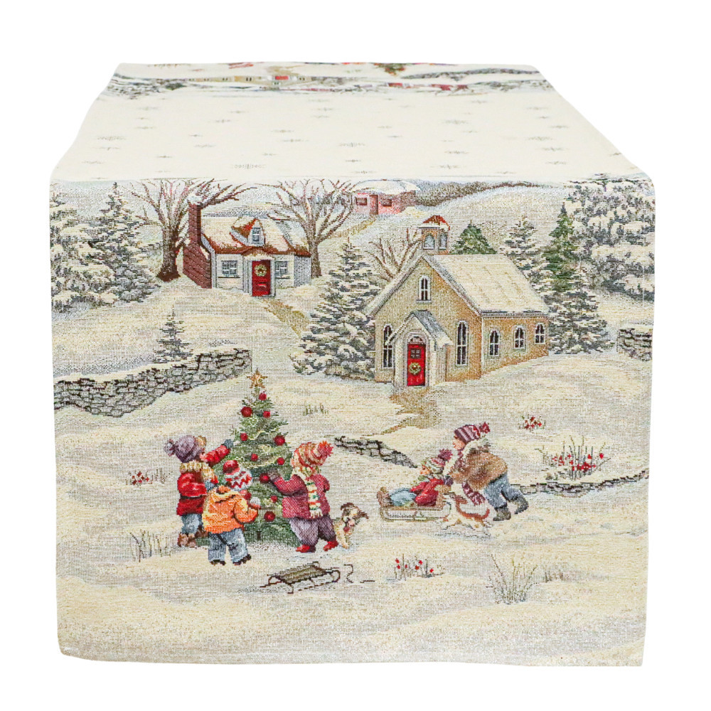 Az asztali futó közepén egyszerű, hópelyhekkel díszített, míg a két végén lévő vidám karácsonyi jelenetek téli vidéki tájat ábrázolnak. Itt kis házak, templomok és örömteli ünneplők, például fenyőfát cipelő és szánkózó gyermekek jelennek meg. A hóborította táj és az ünnepi motívumok harmóniája igazán meleg, meghitt hangulatot teremt az ünnepi összejövetelekhez.